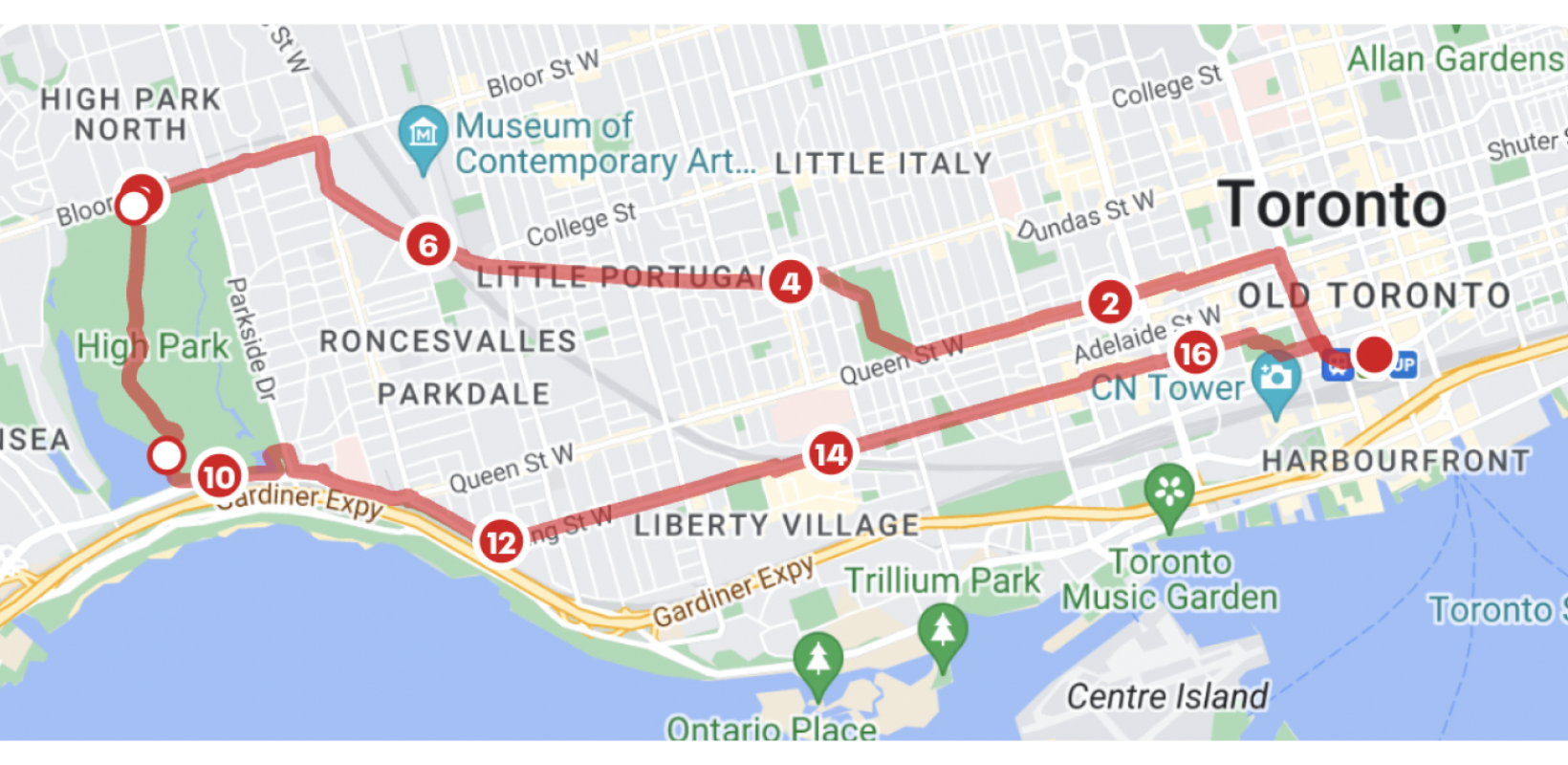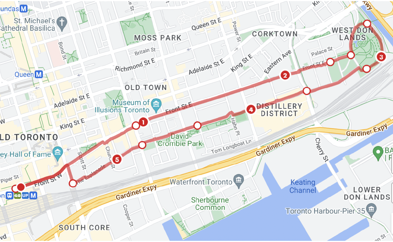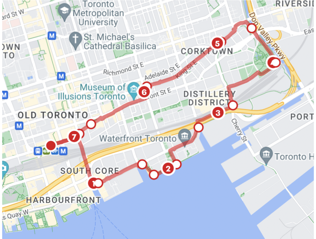 Craving a mix of history and green spaces? This run takes you through the bustling St. Lawrence Market, where the scent of fresh bread and local delicacies fills the air. Then, unwind as you circle through the west downlands and back around through Corktown, taking in the serene atmosphere.