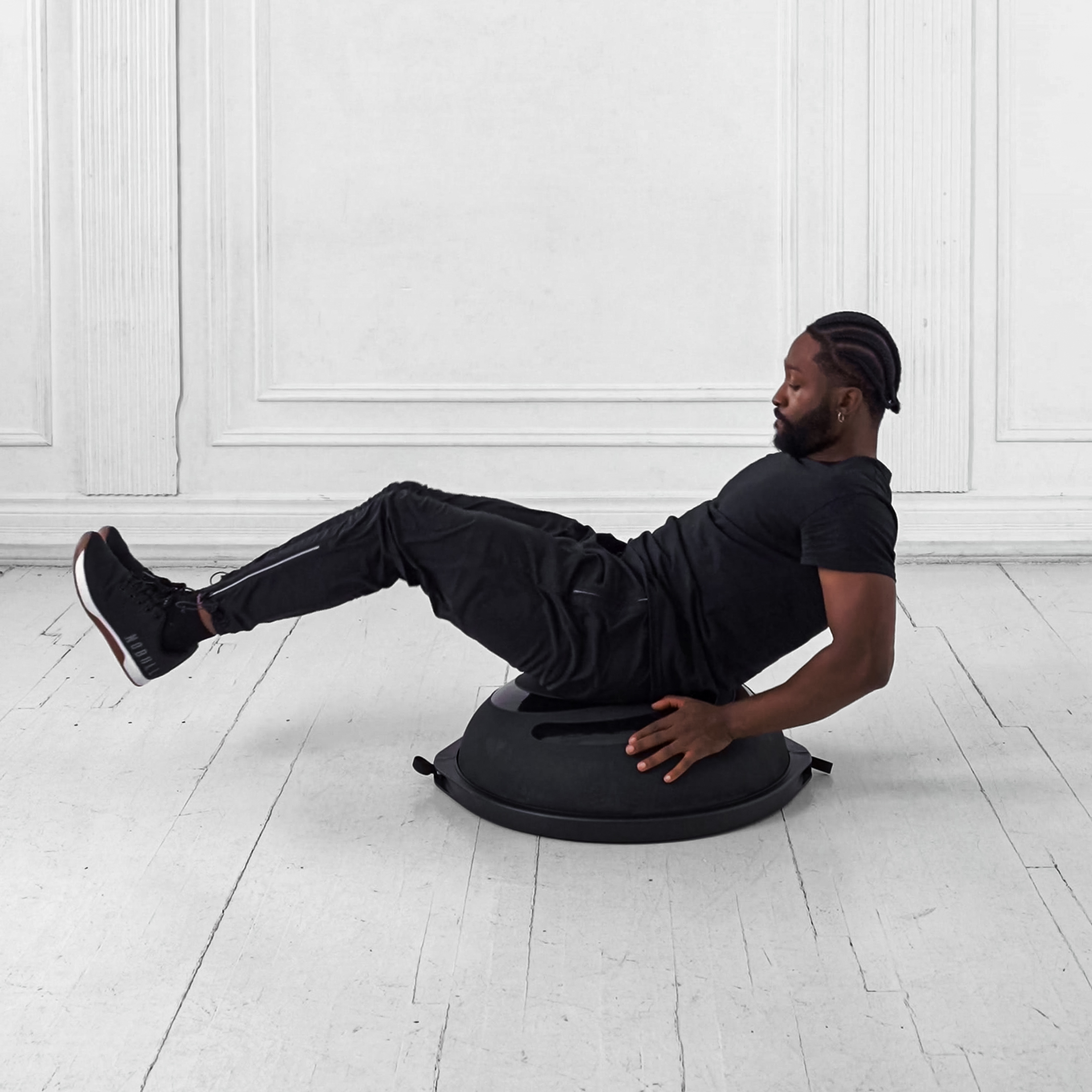 Sit on the dome of the BOSU balance trainer with hands on sides for support. Lean back slightly with core braced, torso nearly parallel to floor, and legs extended hovering off the ground.