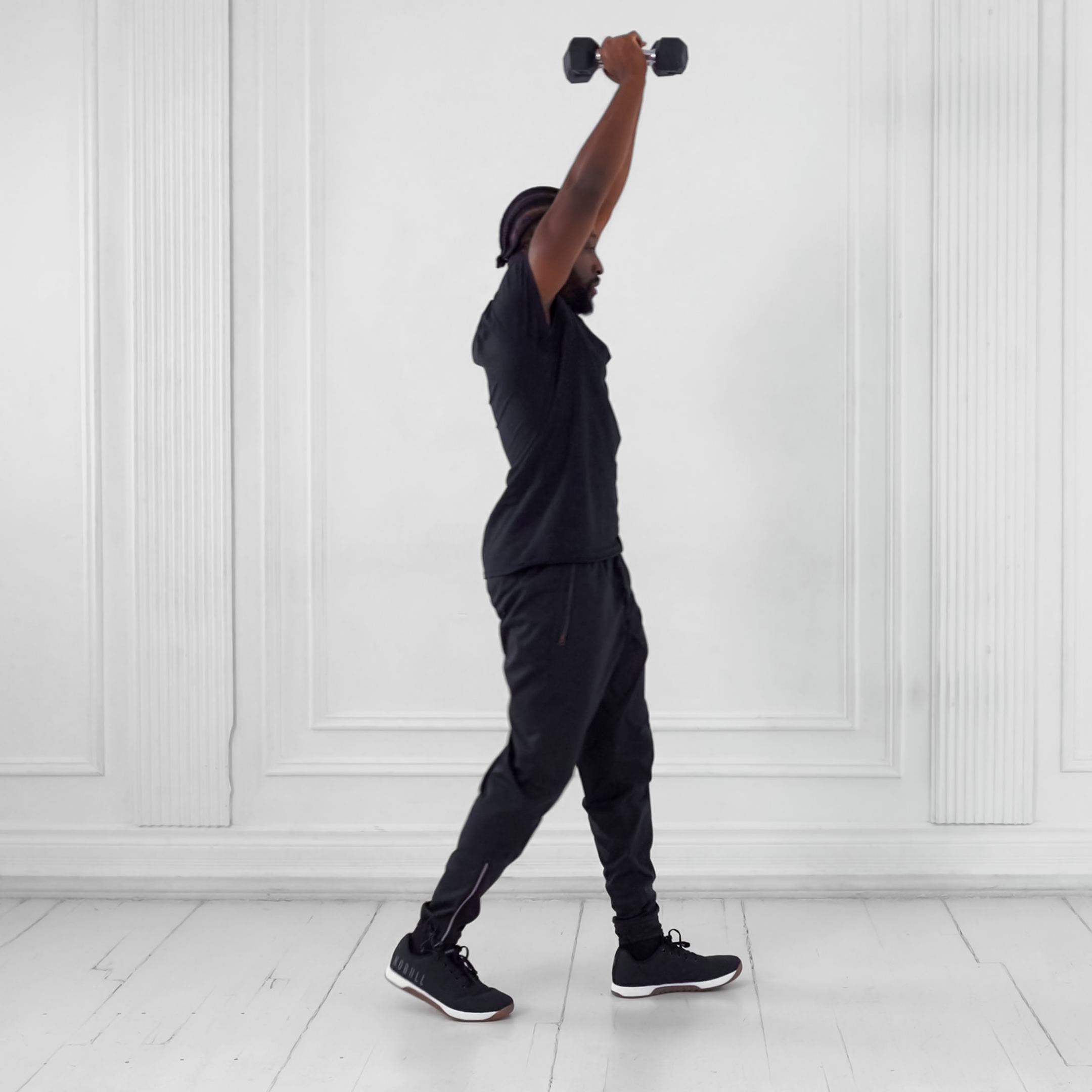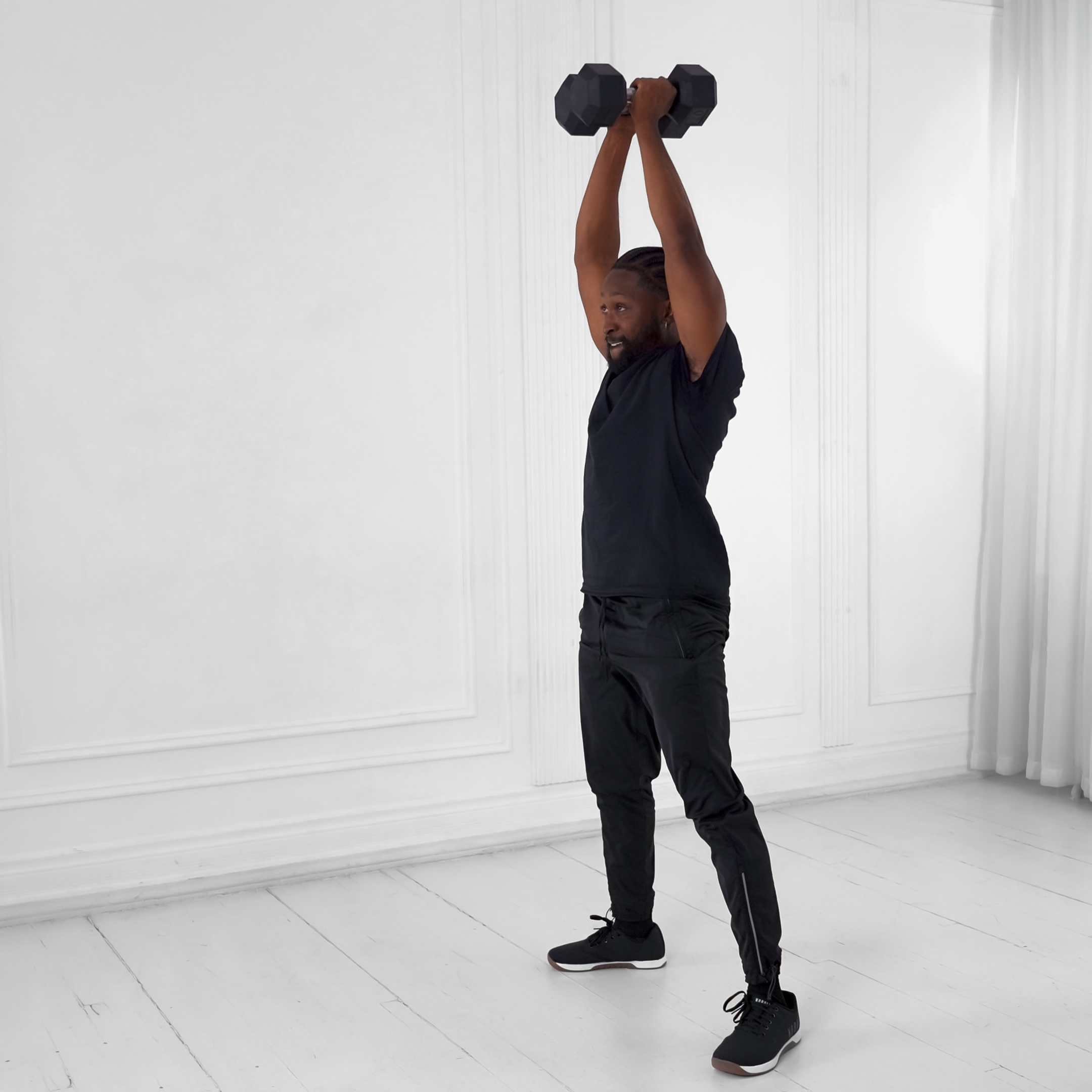 Inhale as you lower the dumbbells; exhale as you press overhead while bracing core.