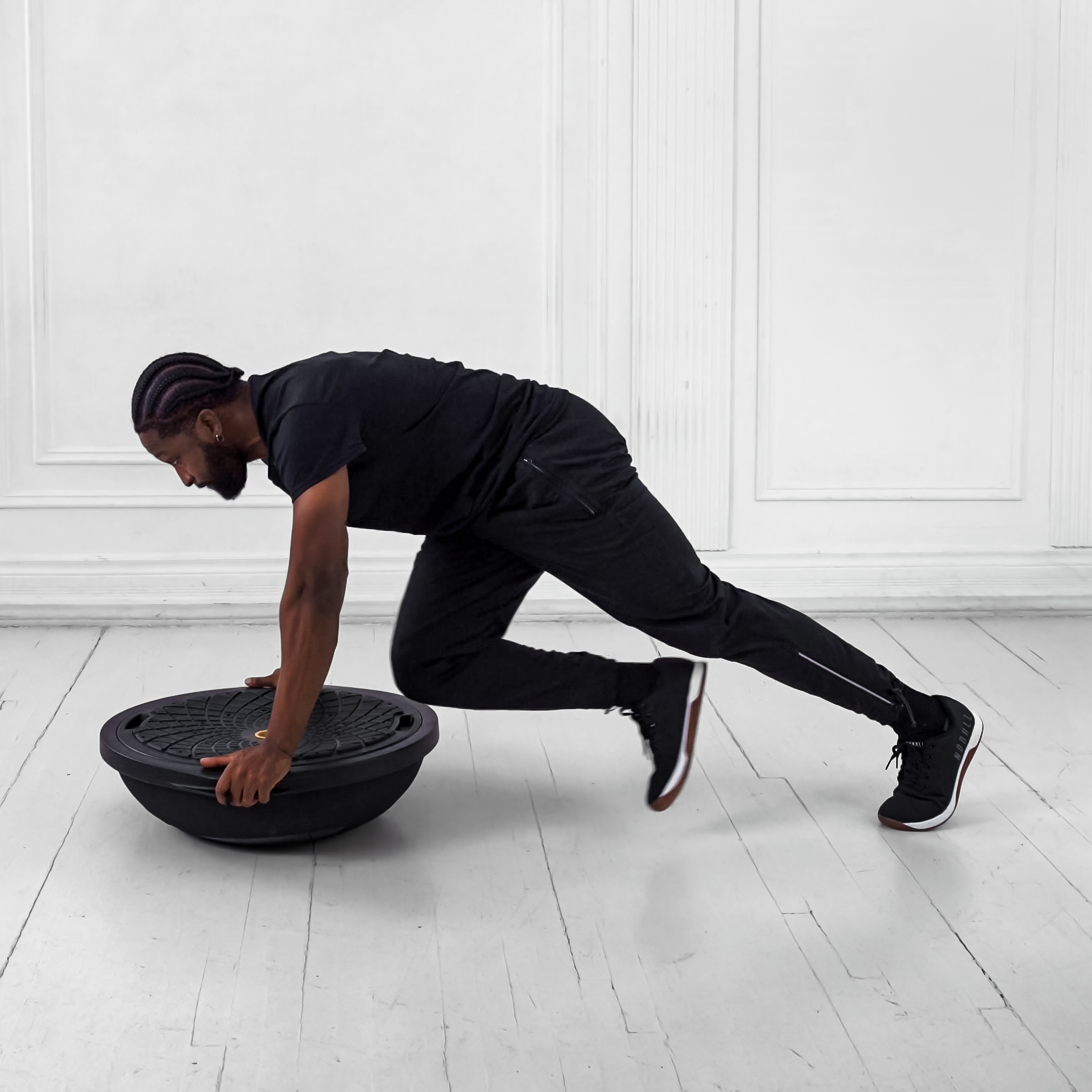 Place BOSU balance trainer flat side down on the floor. Stand facing it with feet shoulder-width apart, one step back.