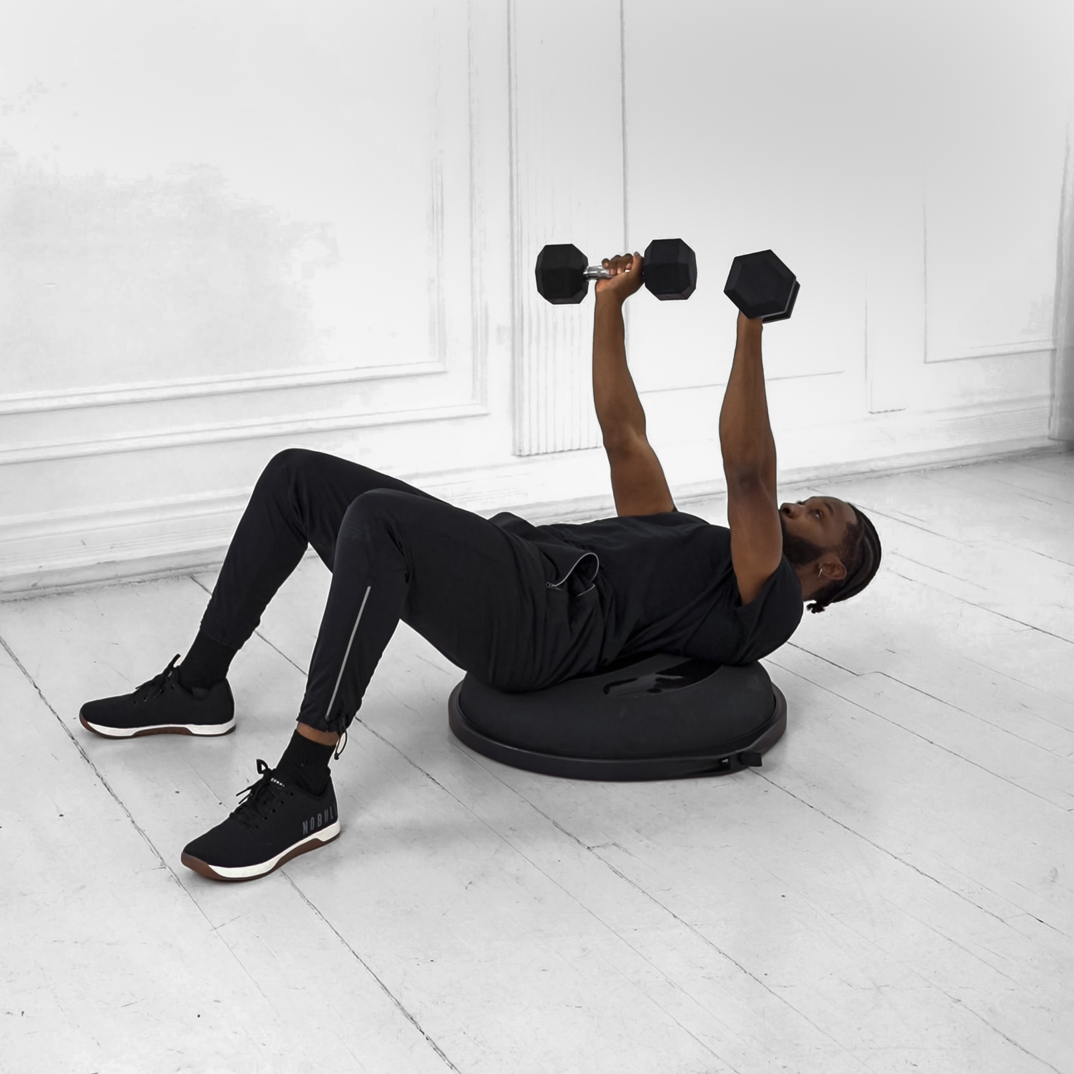 Bodyweight push-up on an unstable balance trainer that targets chest, shoulders, and triceps while building core stability and balance for advanced upper body strength and proprioception.