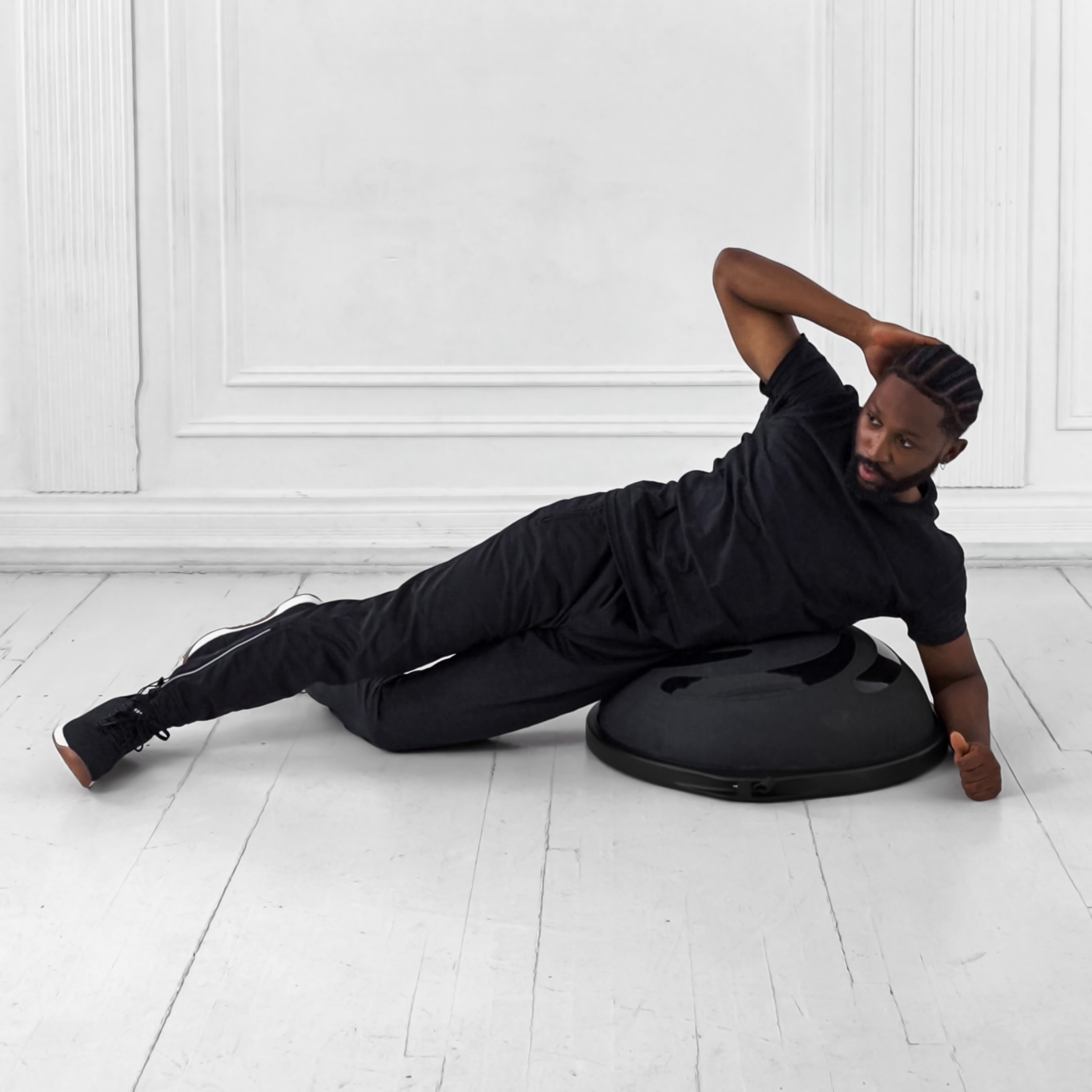 Place balance trainer dome side up on floor. Position hands on dome slightly wider than shoulders and extend body into plank.