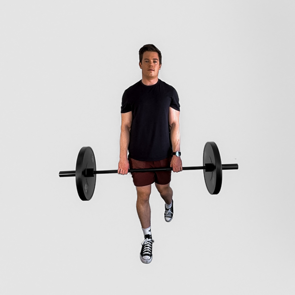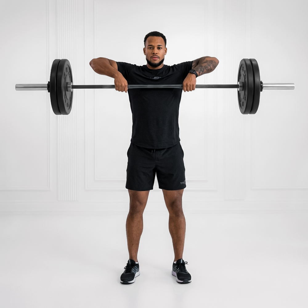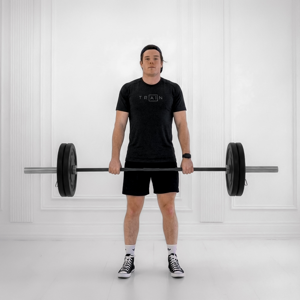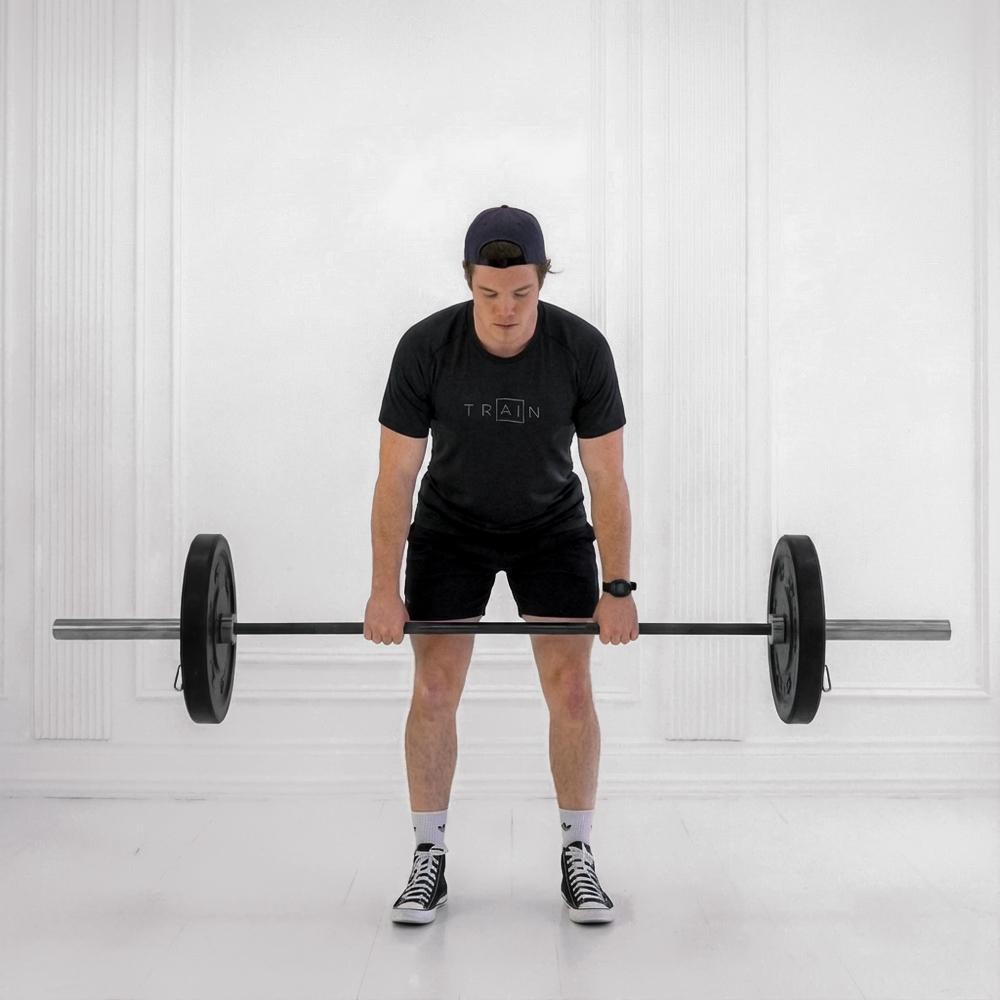 Stand with feet hip-width apart, barbell over mid-foot. Hinge at hips to grip bar shoulder-width with flat back and engaged core.