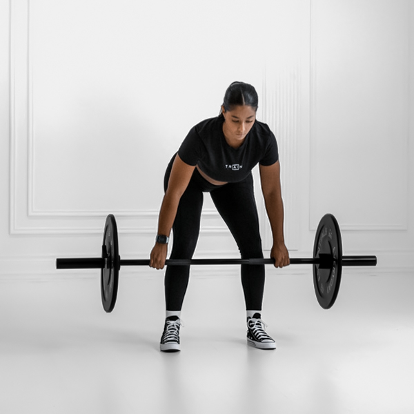 Load a barbell with weight and grip it overhand outside hip-width. Stand on one leg with slight knee bend, extend the other leg back, keeping bar close to body.