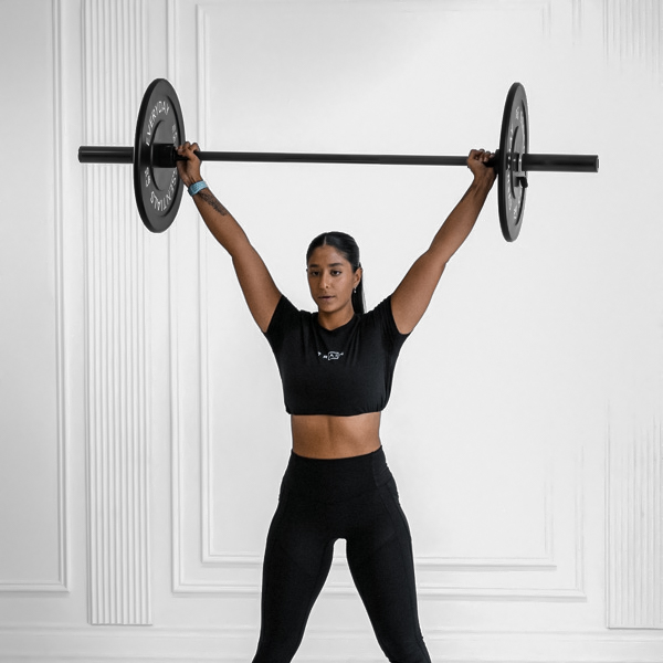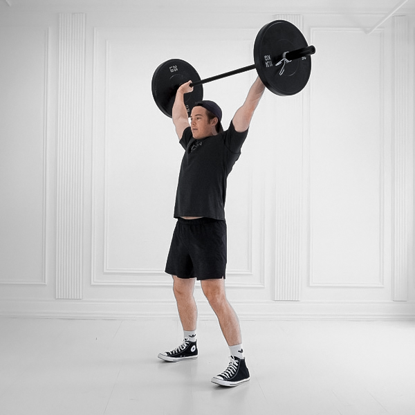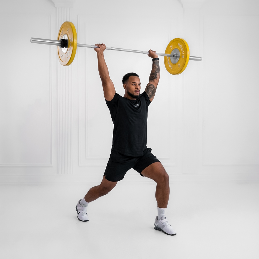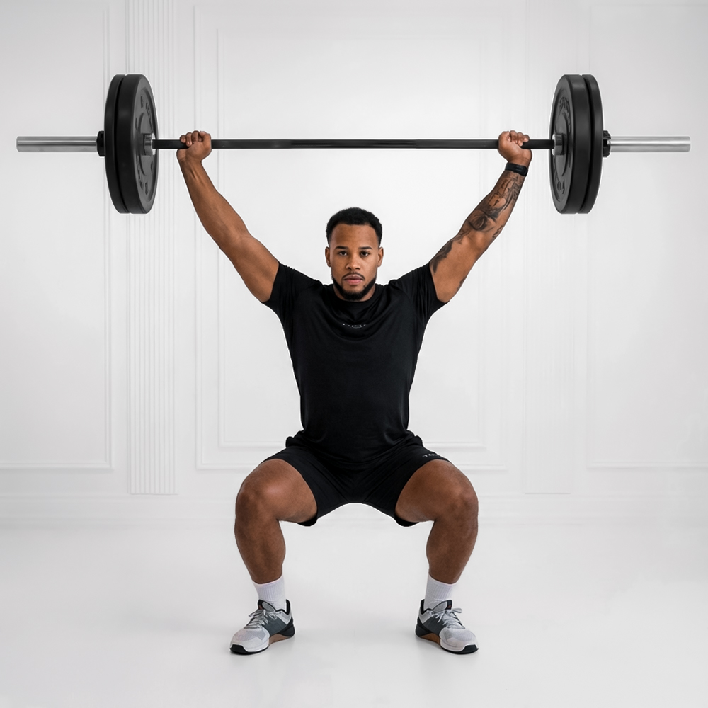 Bar from floor to full triple extension, low hang below knees; catch with hips below knees in overhead squat.