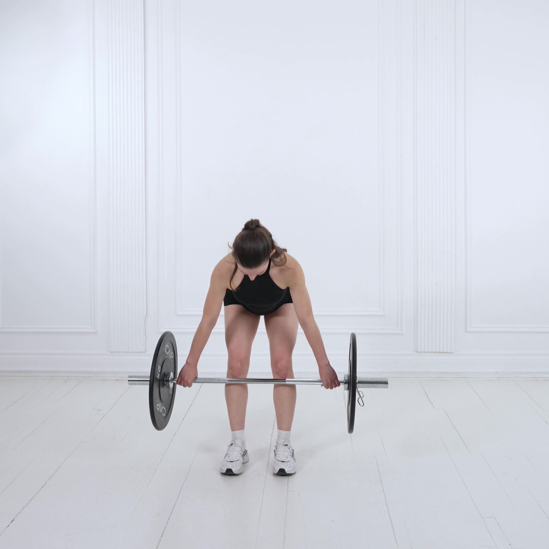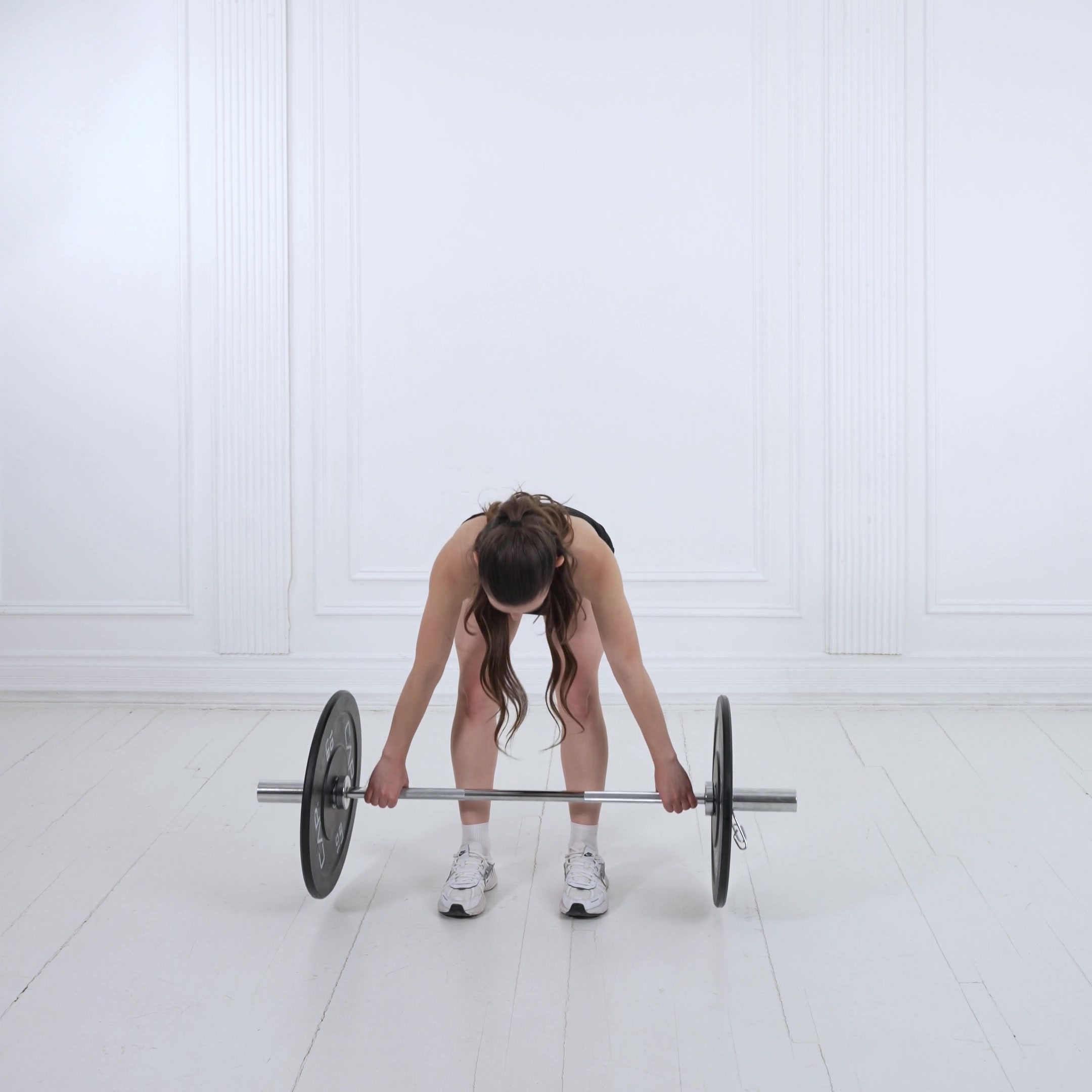 Position barbell over mid-foot with feet hip-width apart, toes out slightly. Grip wide with hook grip, hips low, chest up, back neutral, core braced.