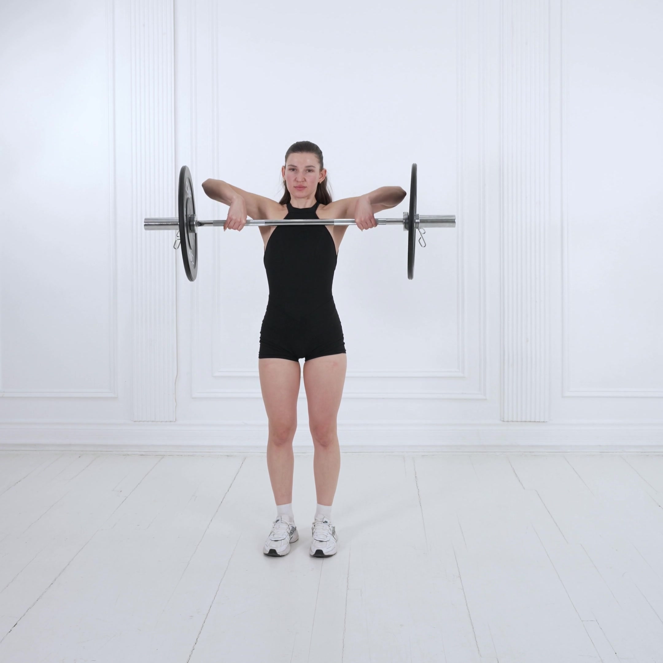 Load a barbell with plates and place it on the floor. Stand with feet shoulder-width apart, hinge at hips to position torso parallel to floor, and grip bar with underhand, shoulder-width hold.