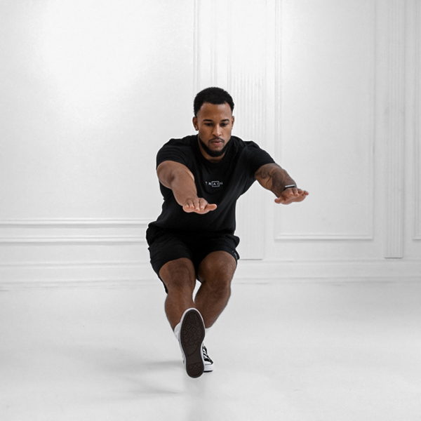 Inhale as you descend into the squat; exhale as you push back to standing.