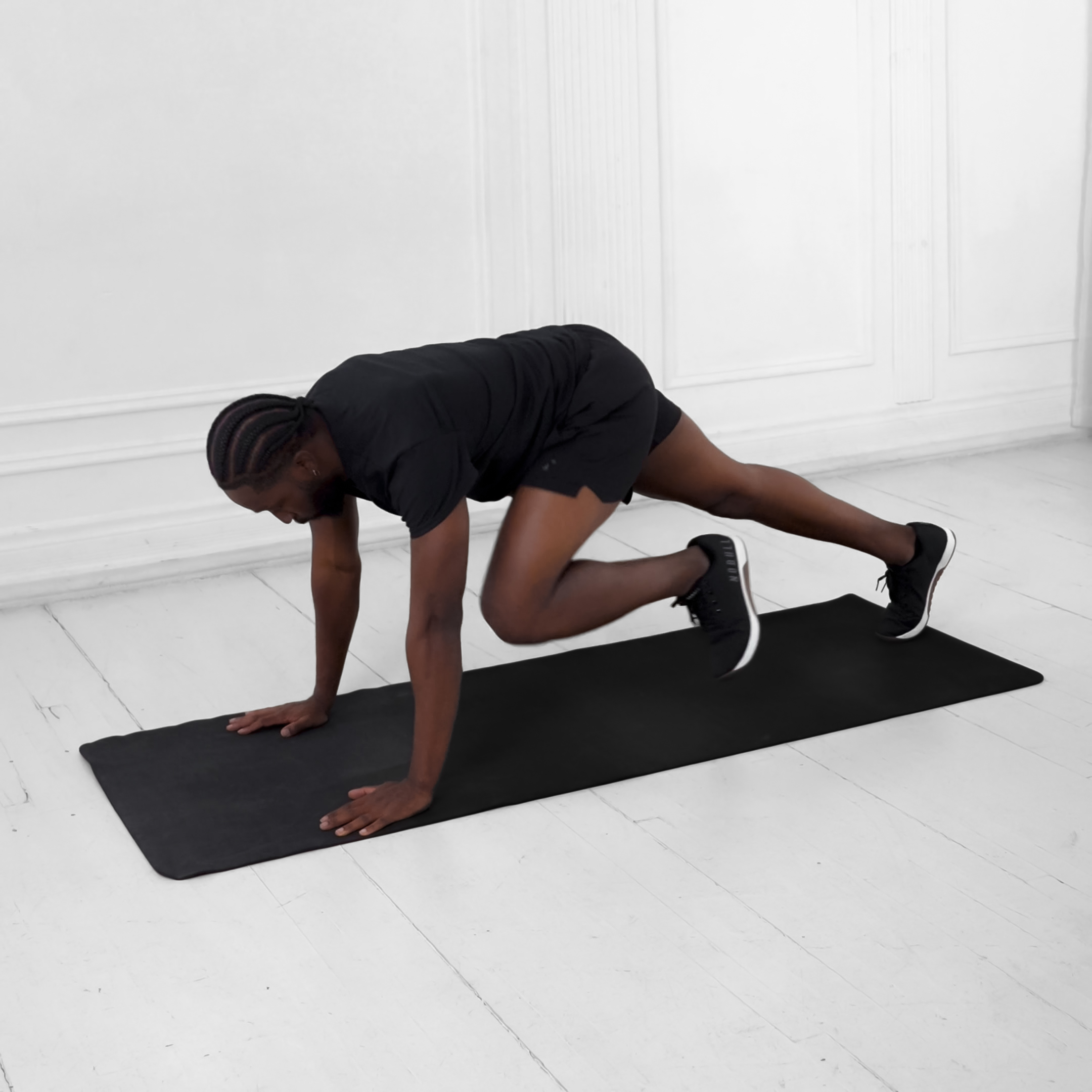 Start in a high plank position with hands slightly wider than shoulders, body straight from head to heels, core engaged.