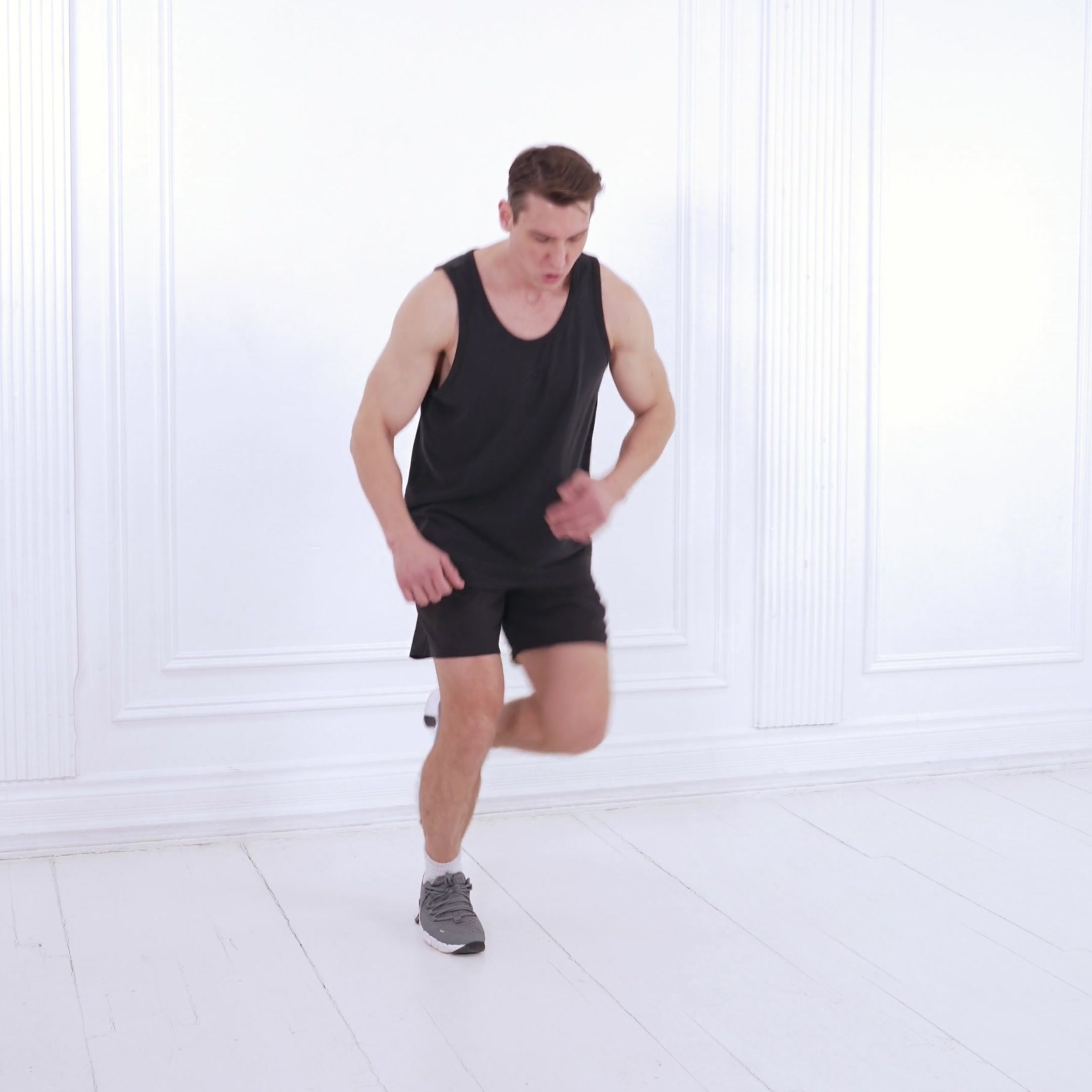Bodyweight cardio exercise mimicking boxing footwork that targets calves, quads, and glutes to build endurance, agility, and coordination; ideal for warm-ups or low-impact conditioning.