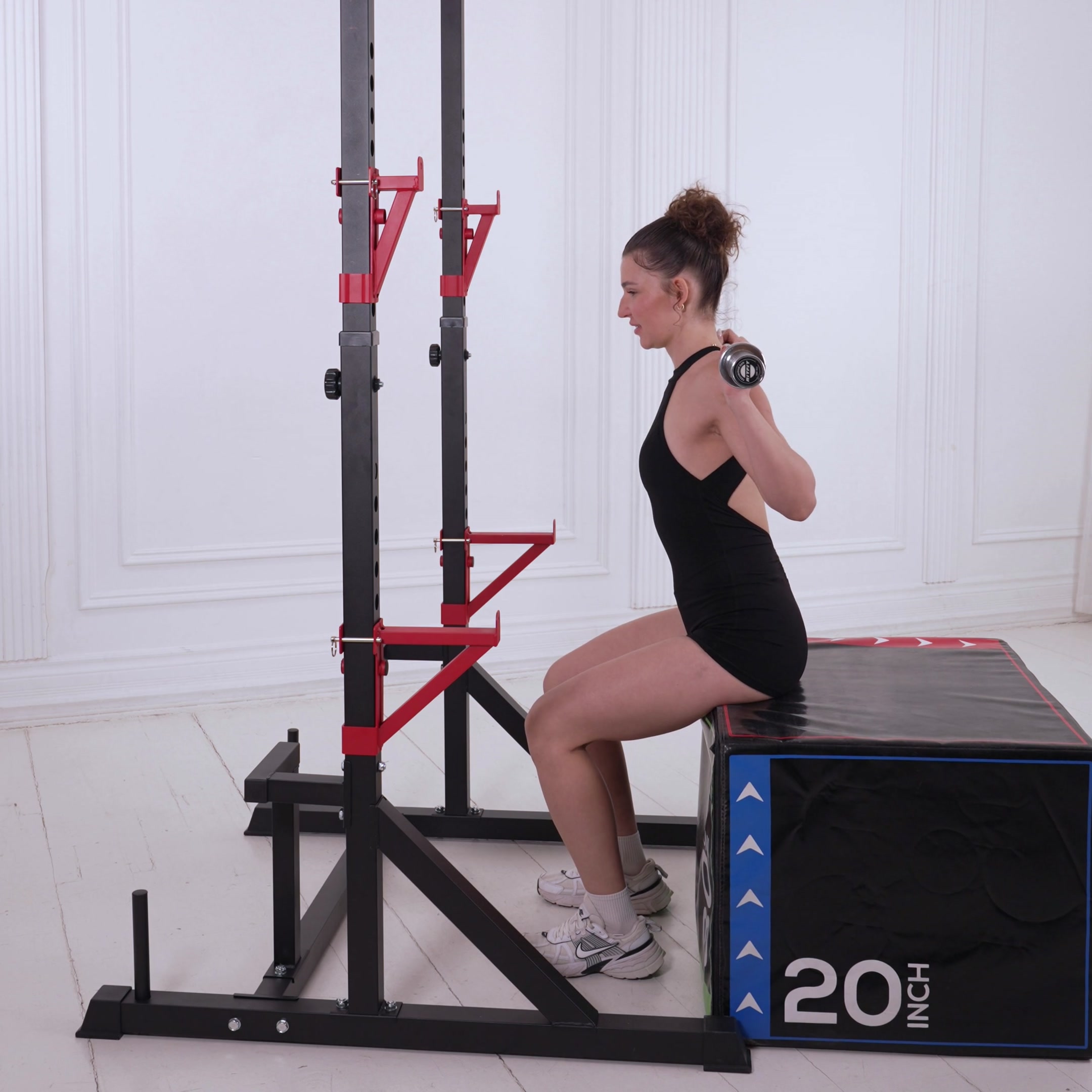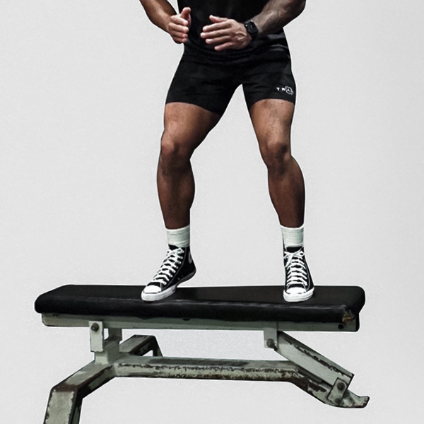 Place a sturdy plyometric box on a non-slip surface and stand facing it, roughly one arm's length away.