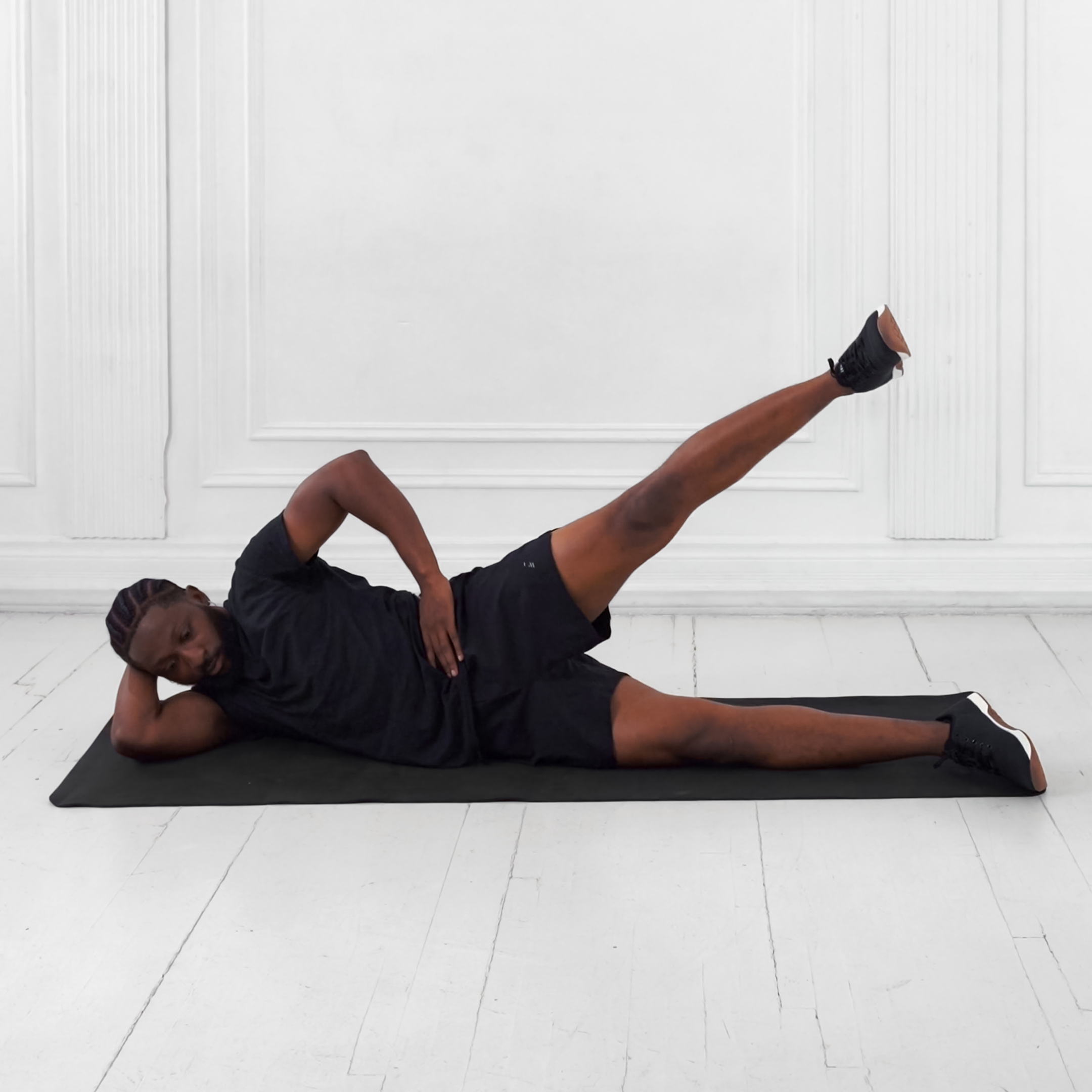 Exhale during the lift to abduct the leg; inhale as you lower it back to start. Brace core throughout.