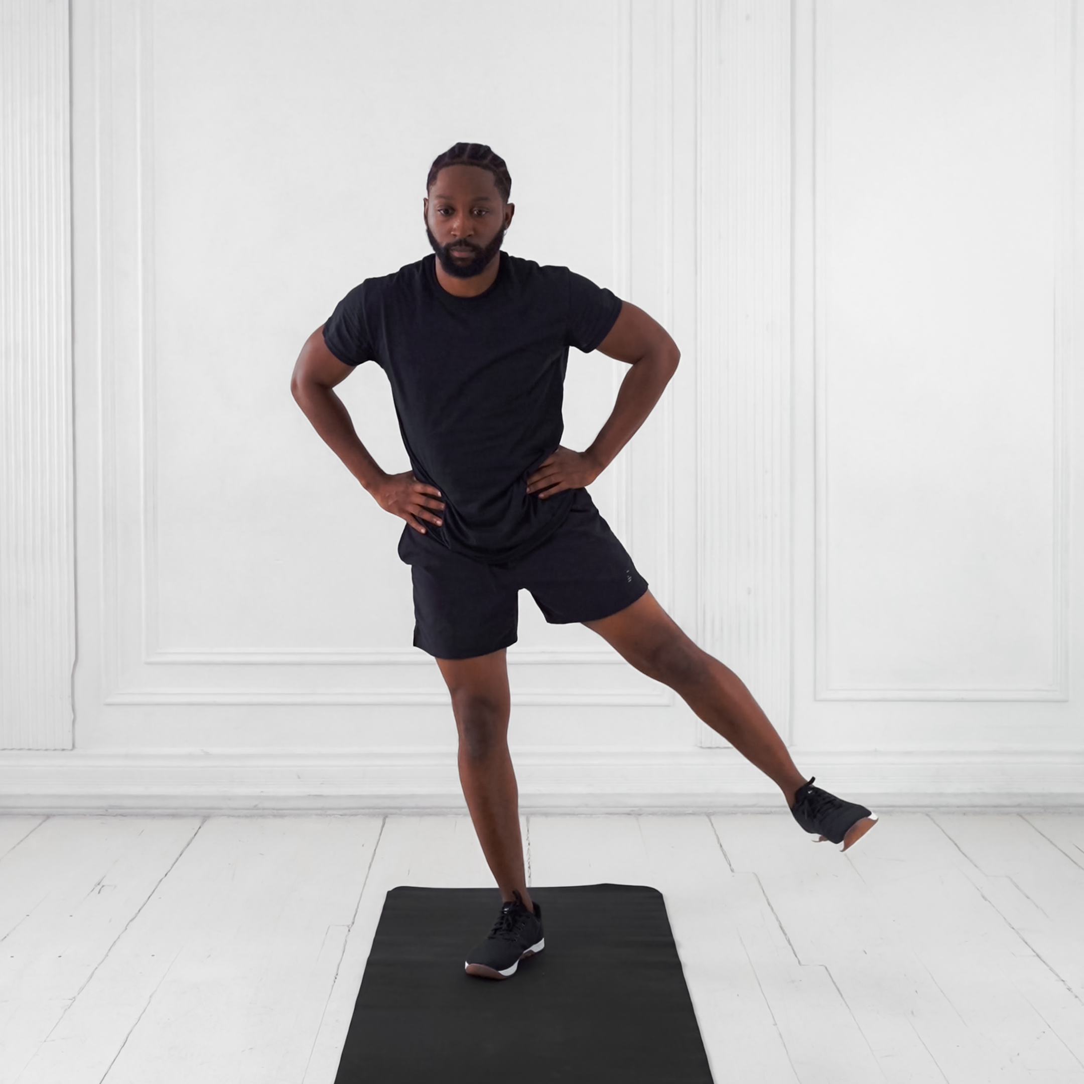 From feet together to leg abducted 45 degrees laterally, maintaining neutral pelvis and straight torso.