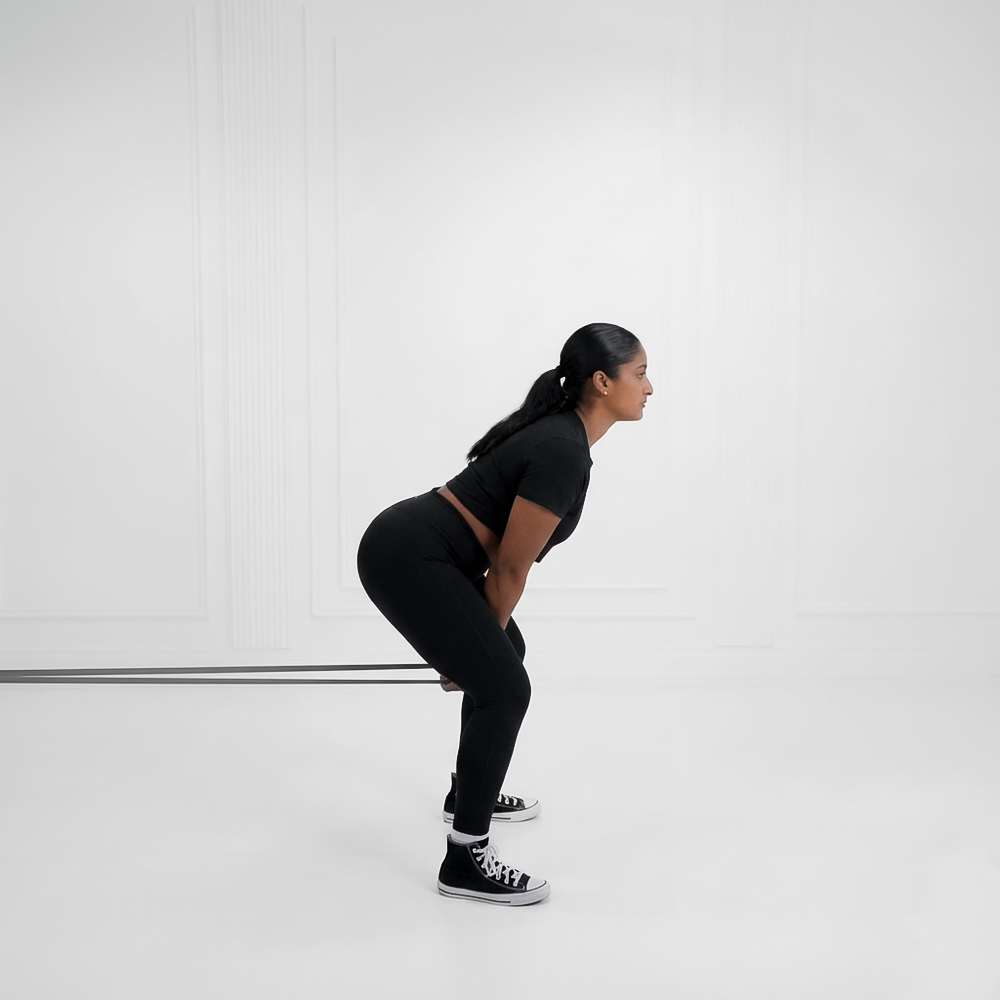 Attach a rope to the low pulley of a cable machine and select a moderate weight. Stand facing away, straddle the rope, grab it between your legs with straight arms, and step forward to create tension with a neutral spine and engaged core.