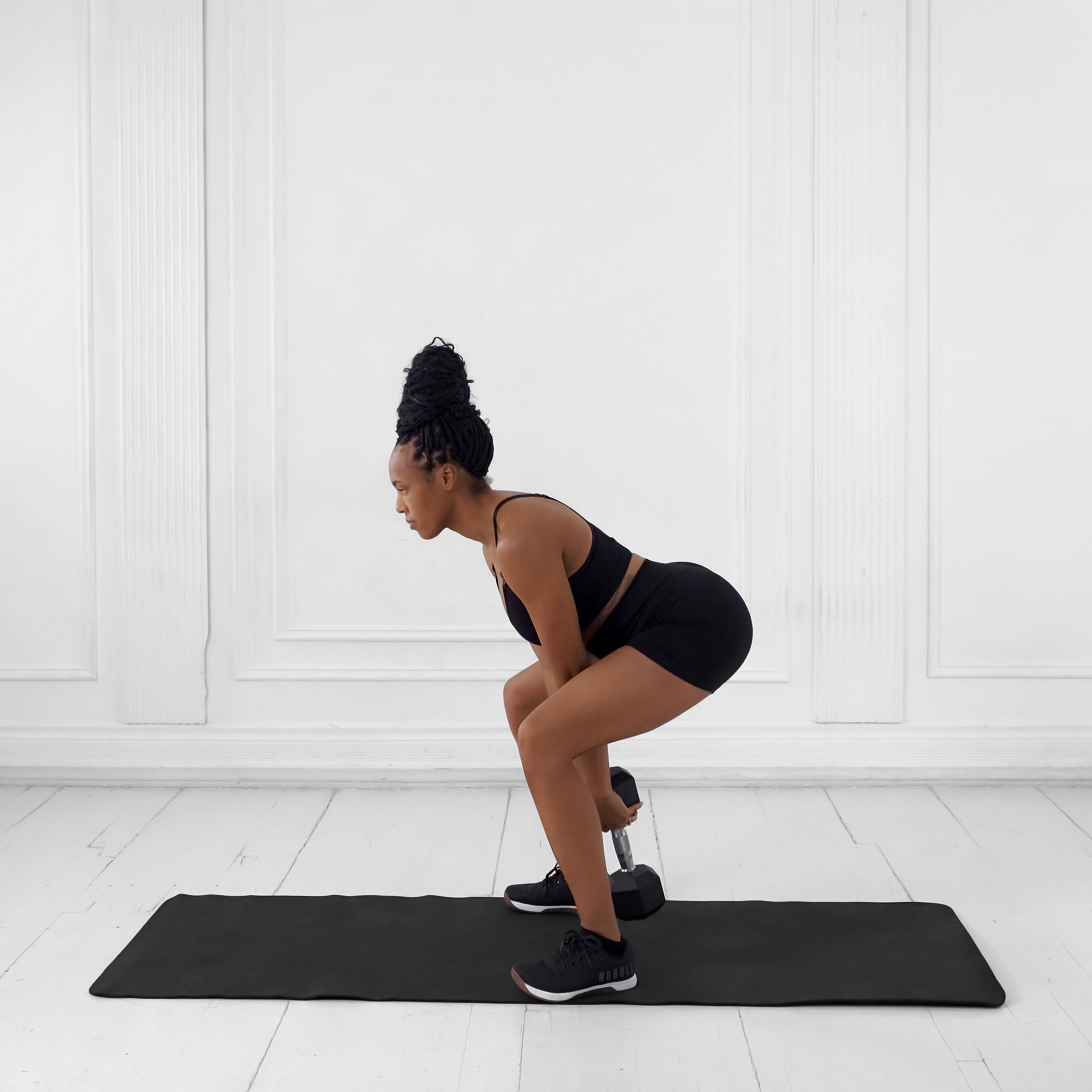 Inhale as you hinge forward; exhale as you extend your hips and squeeze your glutes.