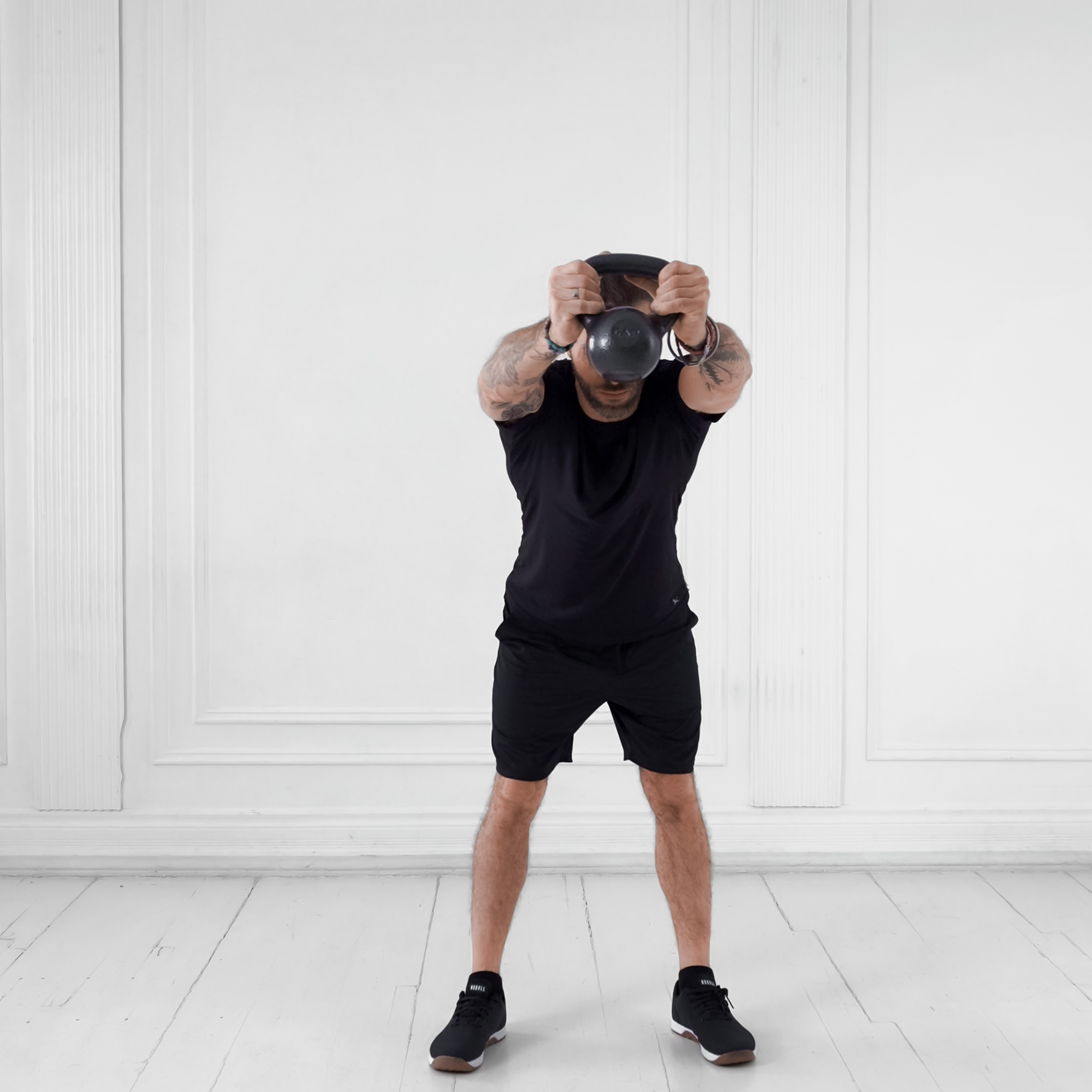 Place two kettlebells on the floor between feet shoulder-width apart. Stand with feet hip-width, hinge at hips to grip handles overhand, back straight and chest up.
