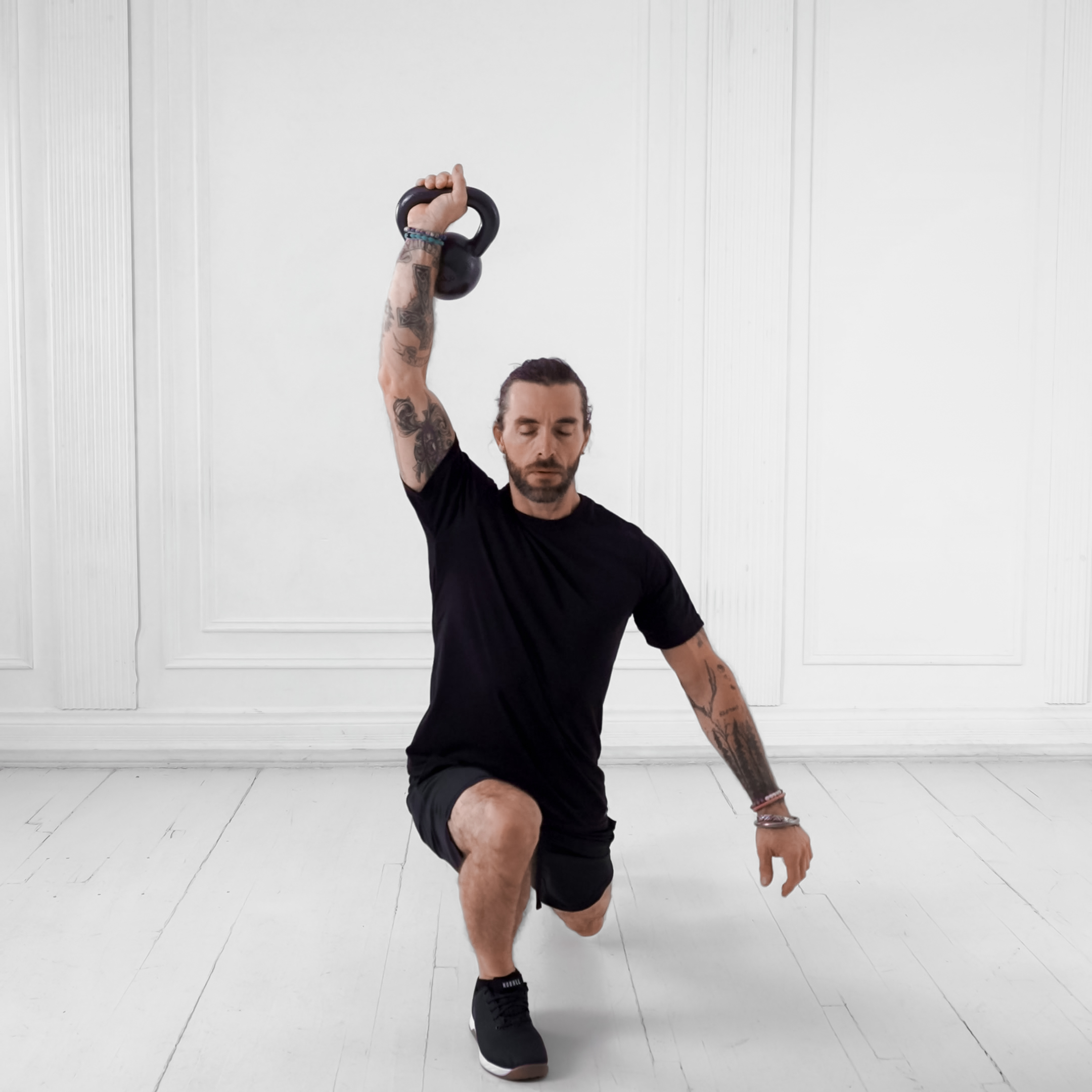 Kettlebells from ground to rack at shoulders via hip extension, then shallow leg dip to full overhead lockout with arms straight and kettlebells over shoulders.