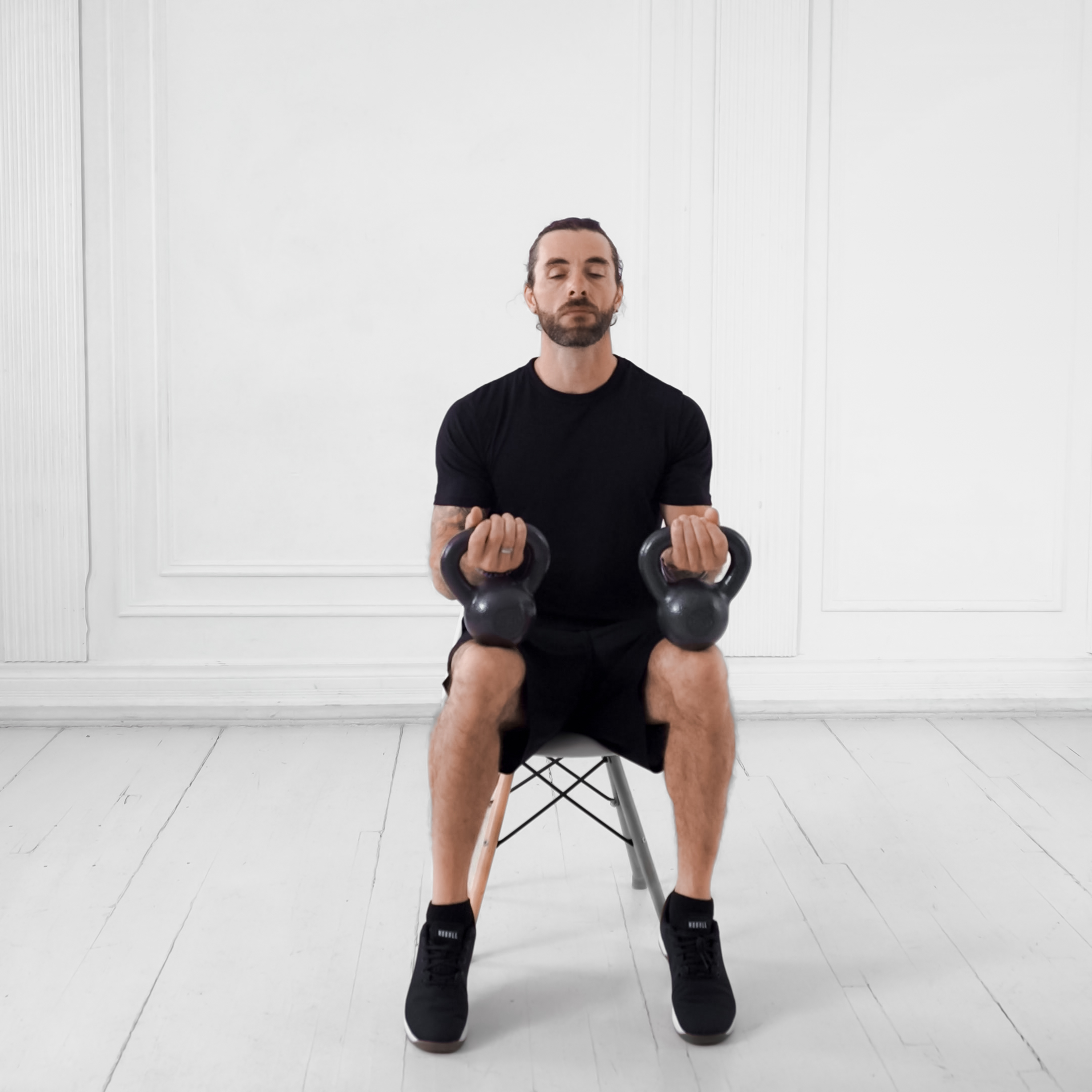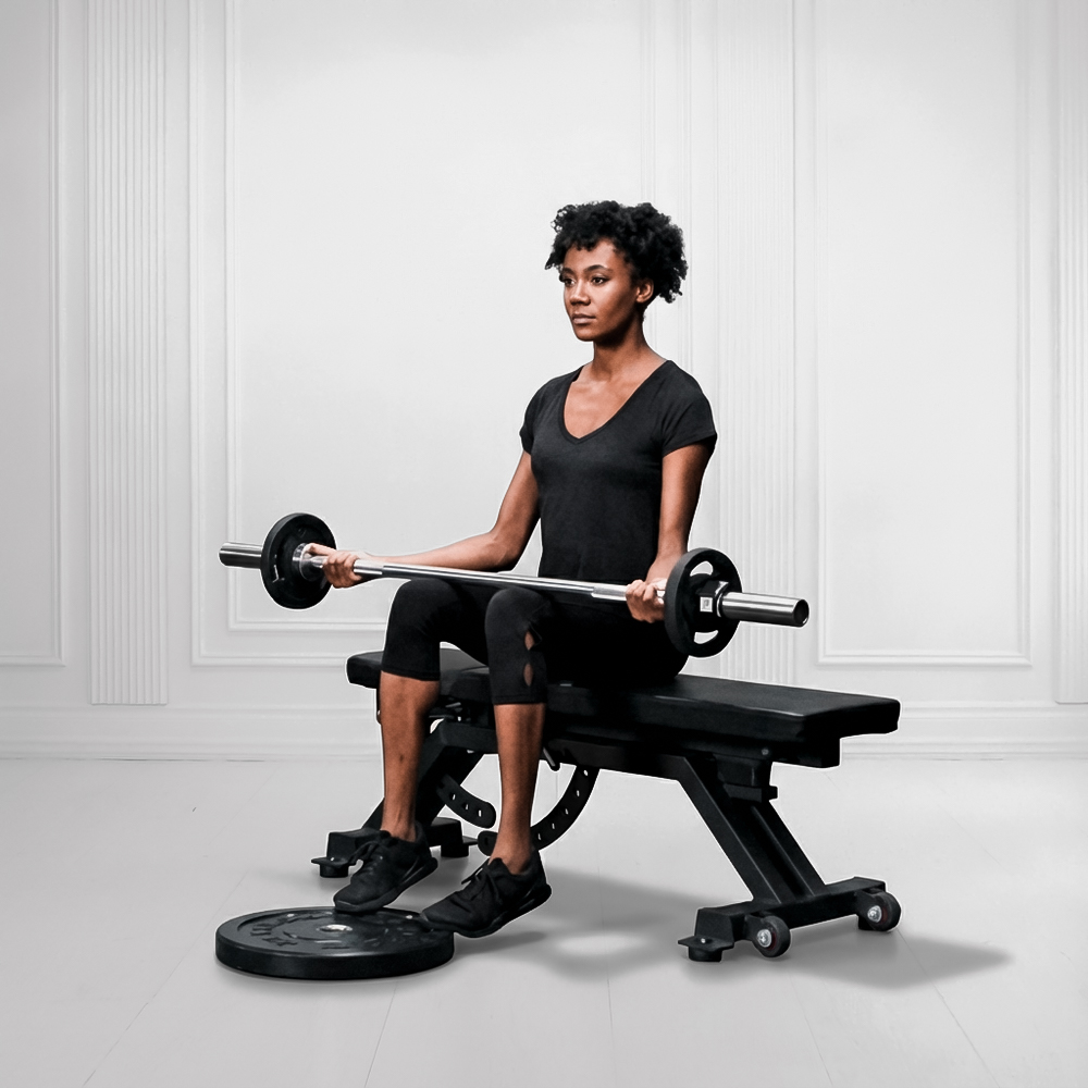 Sit on a bench with back straight and knees bent at 90 degrees. Place balls of feet on an elevated surface with heels hanging off, and position dumbbells across upper thighs behind knees, holding them stable.