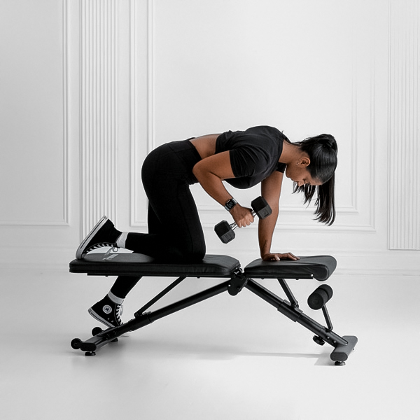 Stand or sit with feet shoulder-width apart, core engaged. Hold a dumbbell overhead in one hand with your elbow bent slightly and upper arm close to your head.