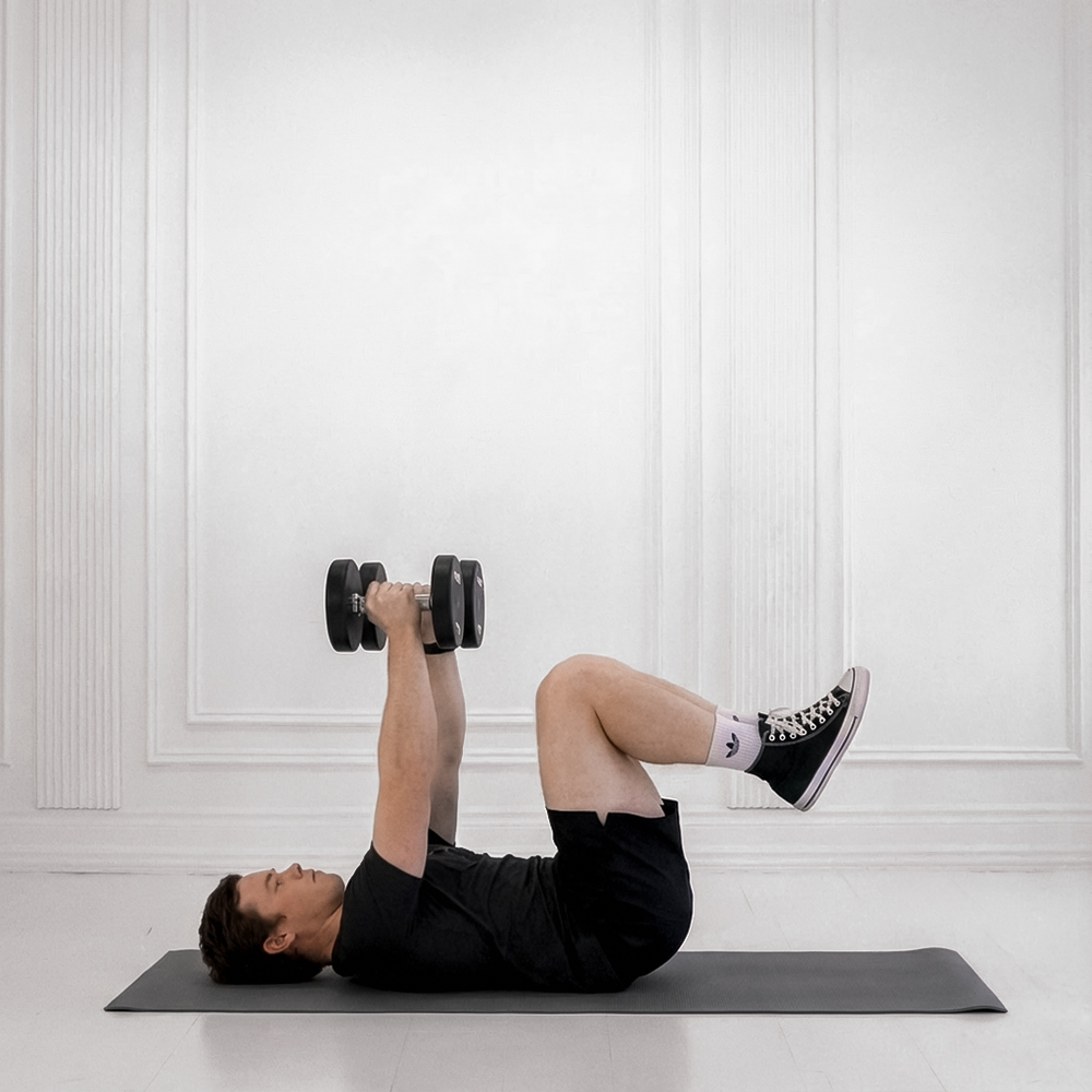 Lie flat on your back on a mat with knees bent and feet flat on the floor. Hold one dumbbell securely across your chest with both hands.