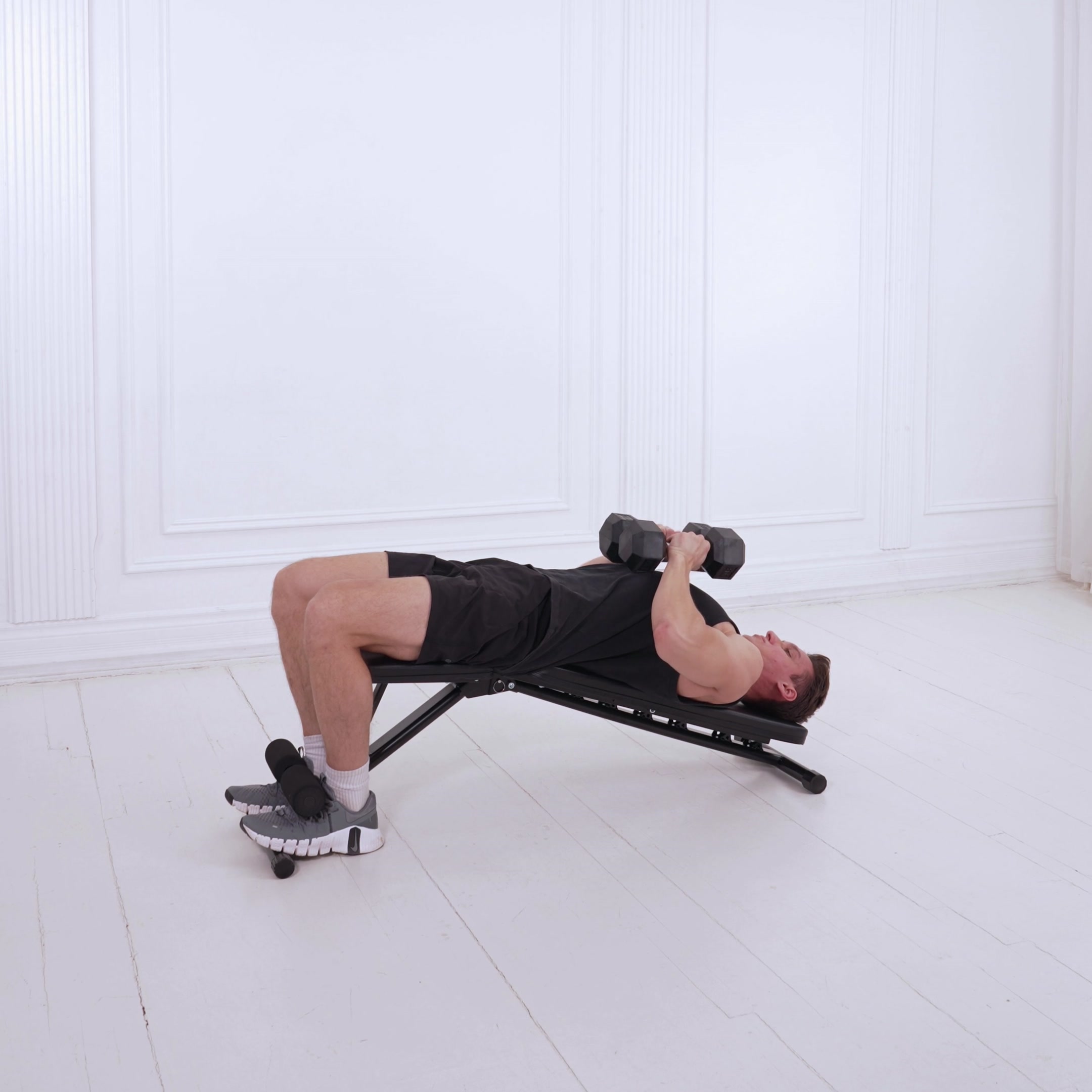 Adjust decline bench to 15-30 degrees. Lie back with feet secured under pads, holding dumbbells at chest level with palms facing forward and shoulder blades retracted.
