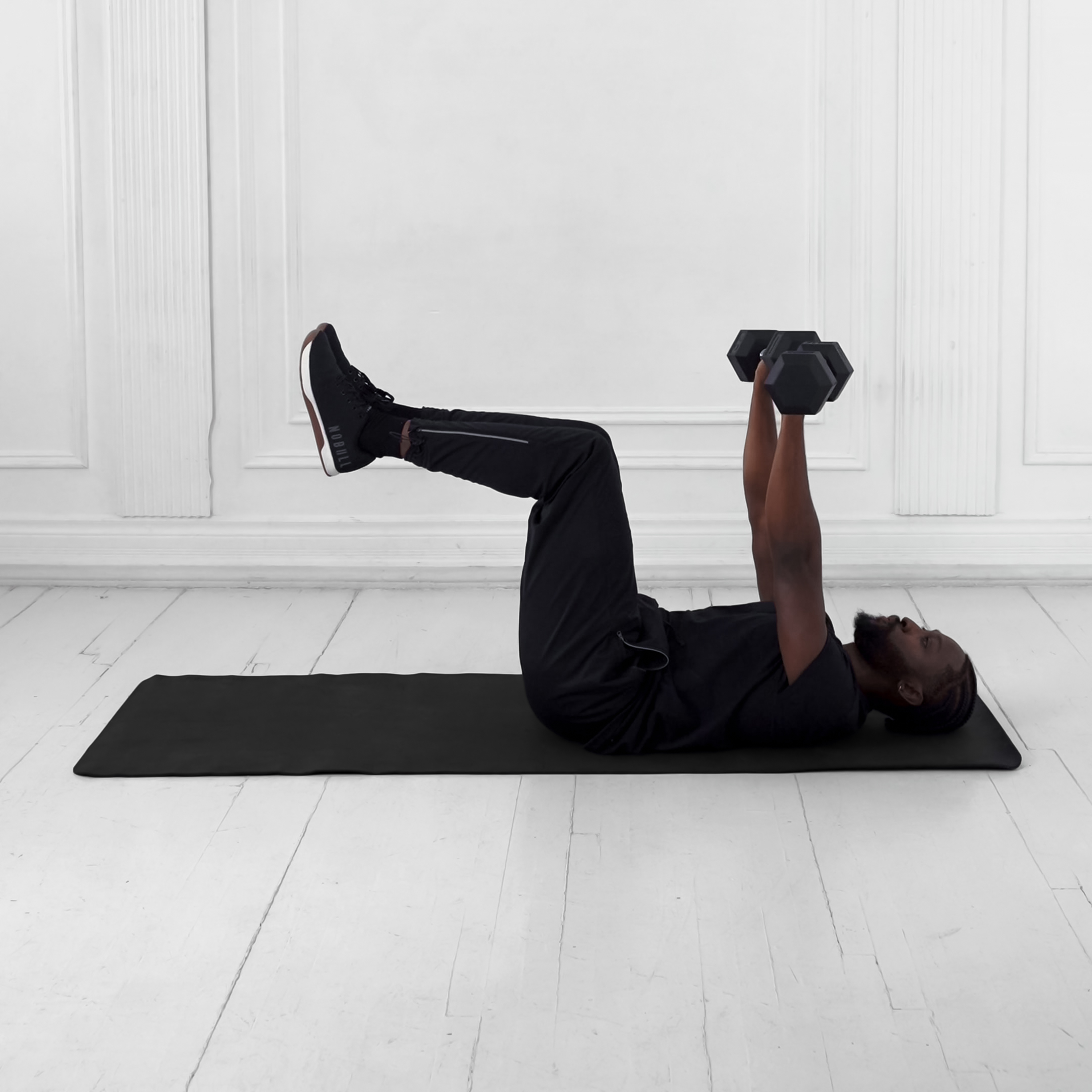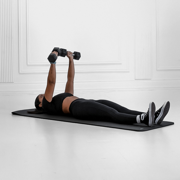 Lie flat on your back on the floor with knees bent and feet flat for stability. Hold a dumbbell in each hand above your chest with arms extended but elbows slightly bent and palms facing each other.