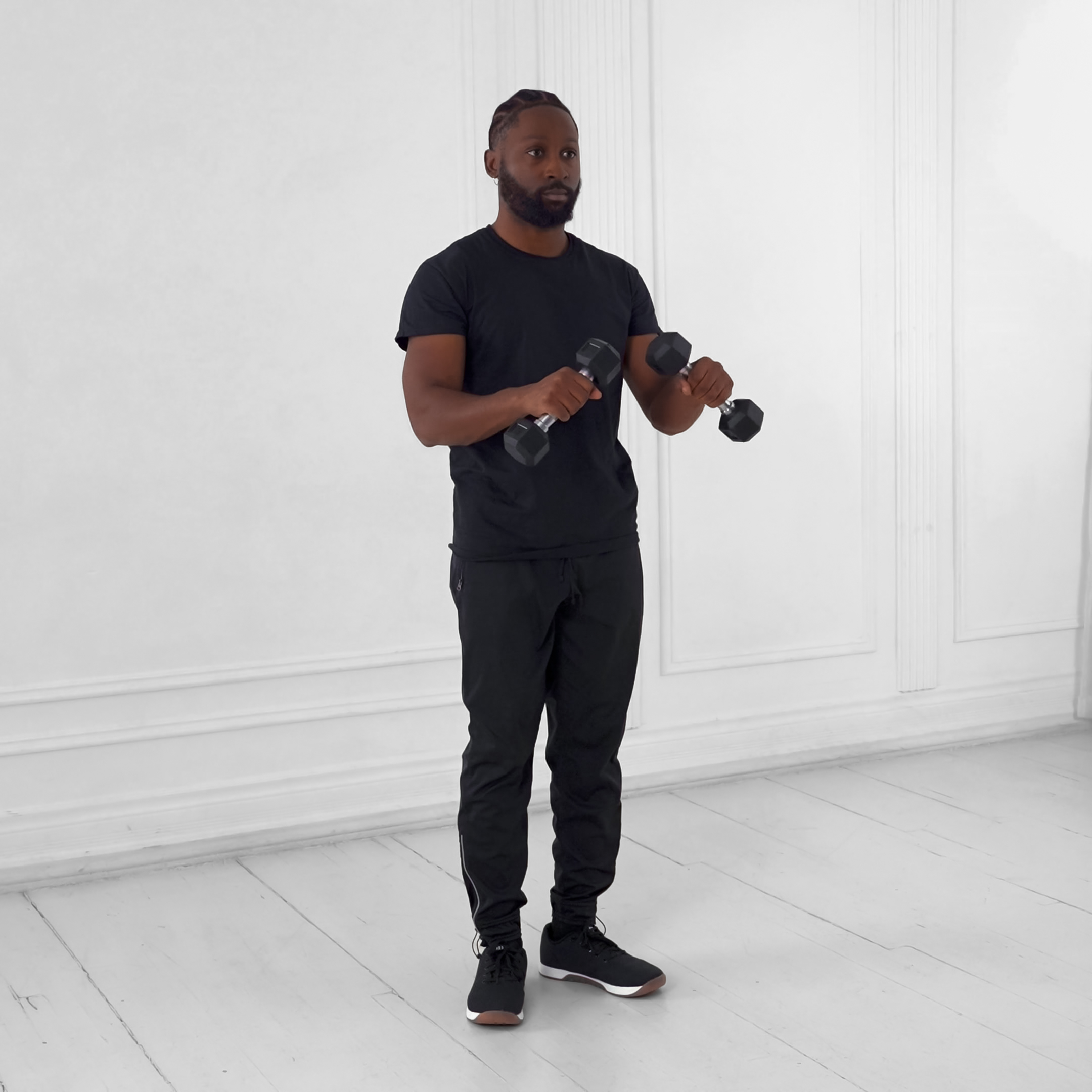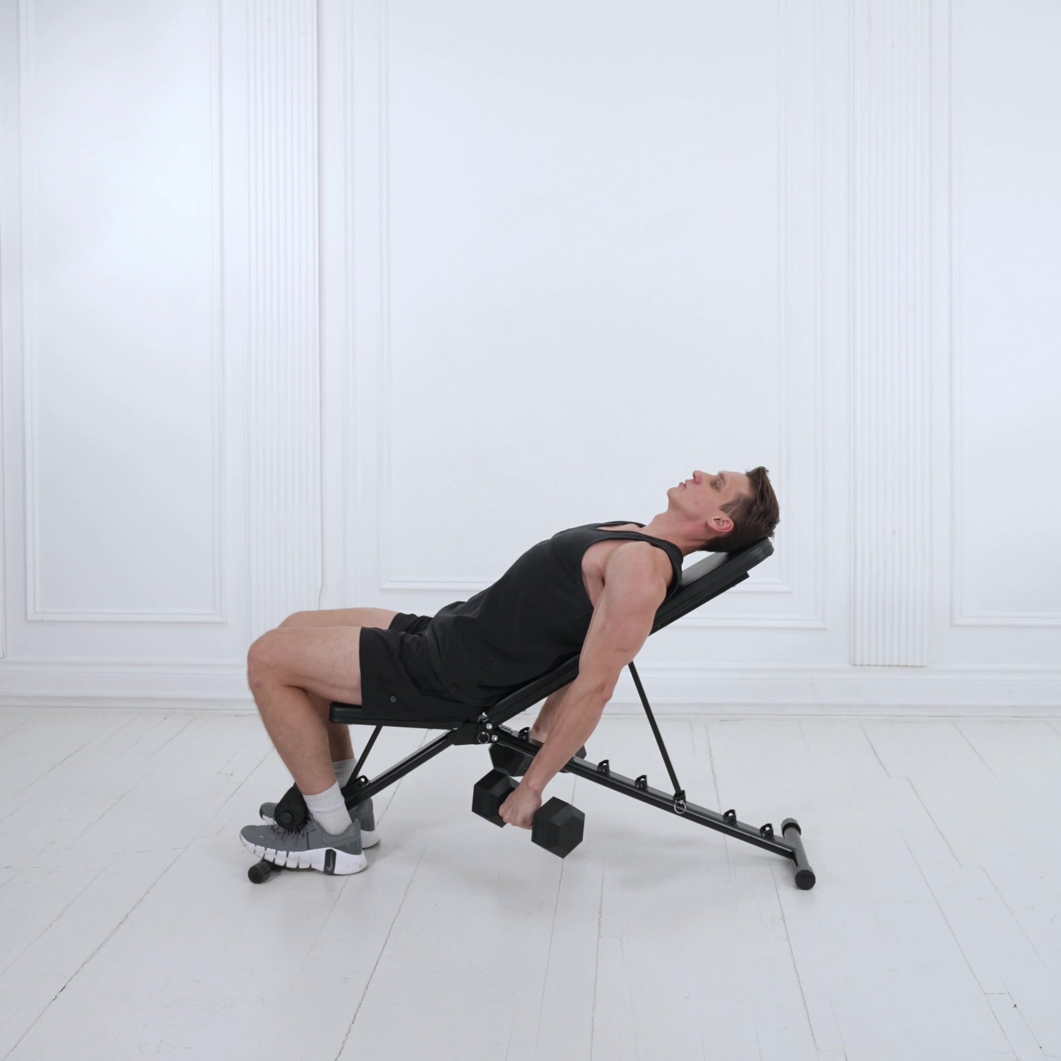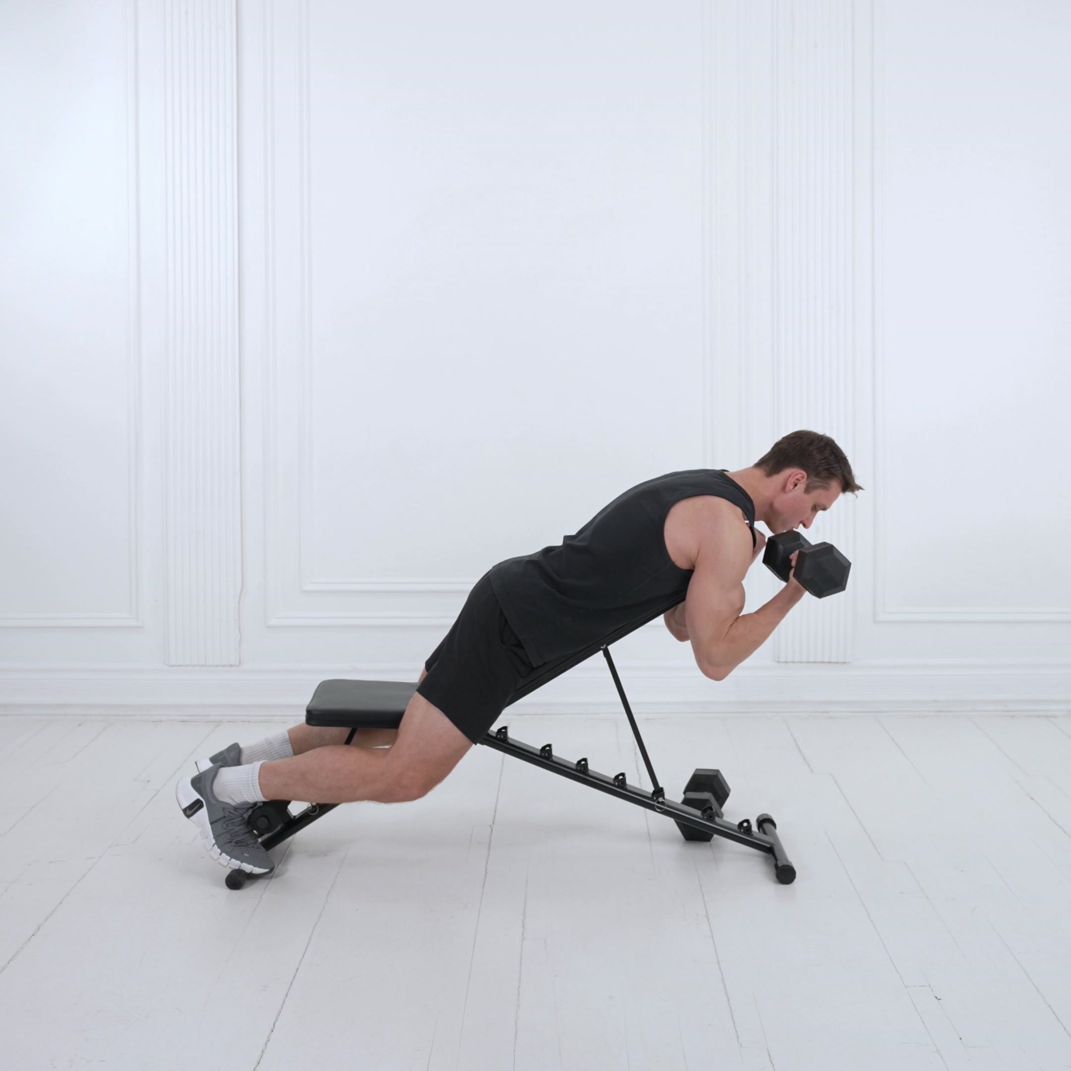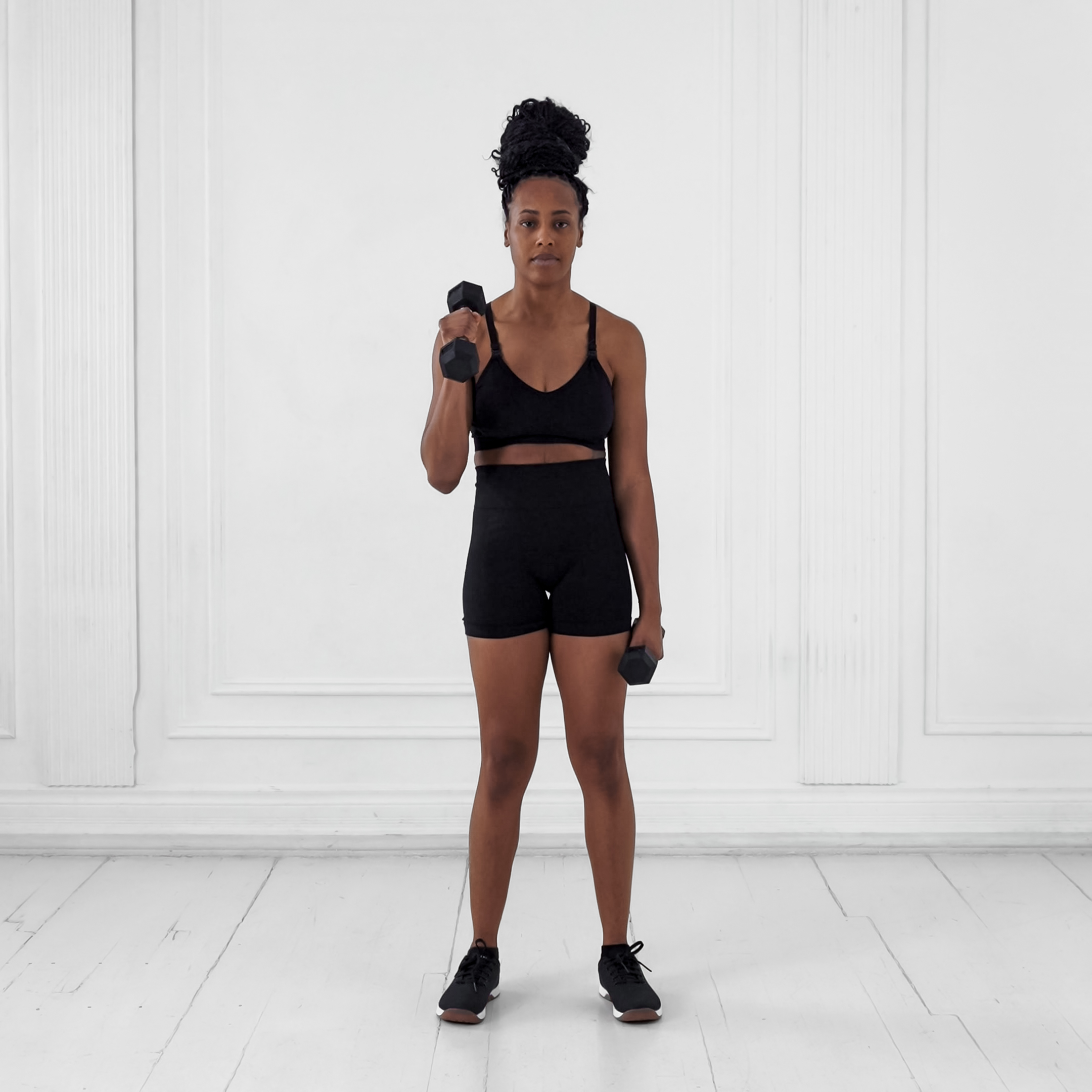 Inhale as you lower the weights; exhale as you curl upward and brace core.