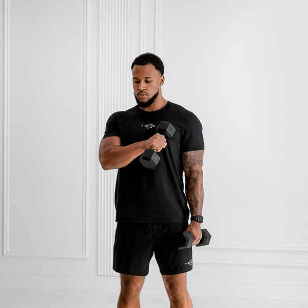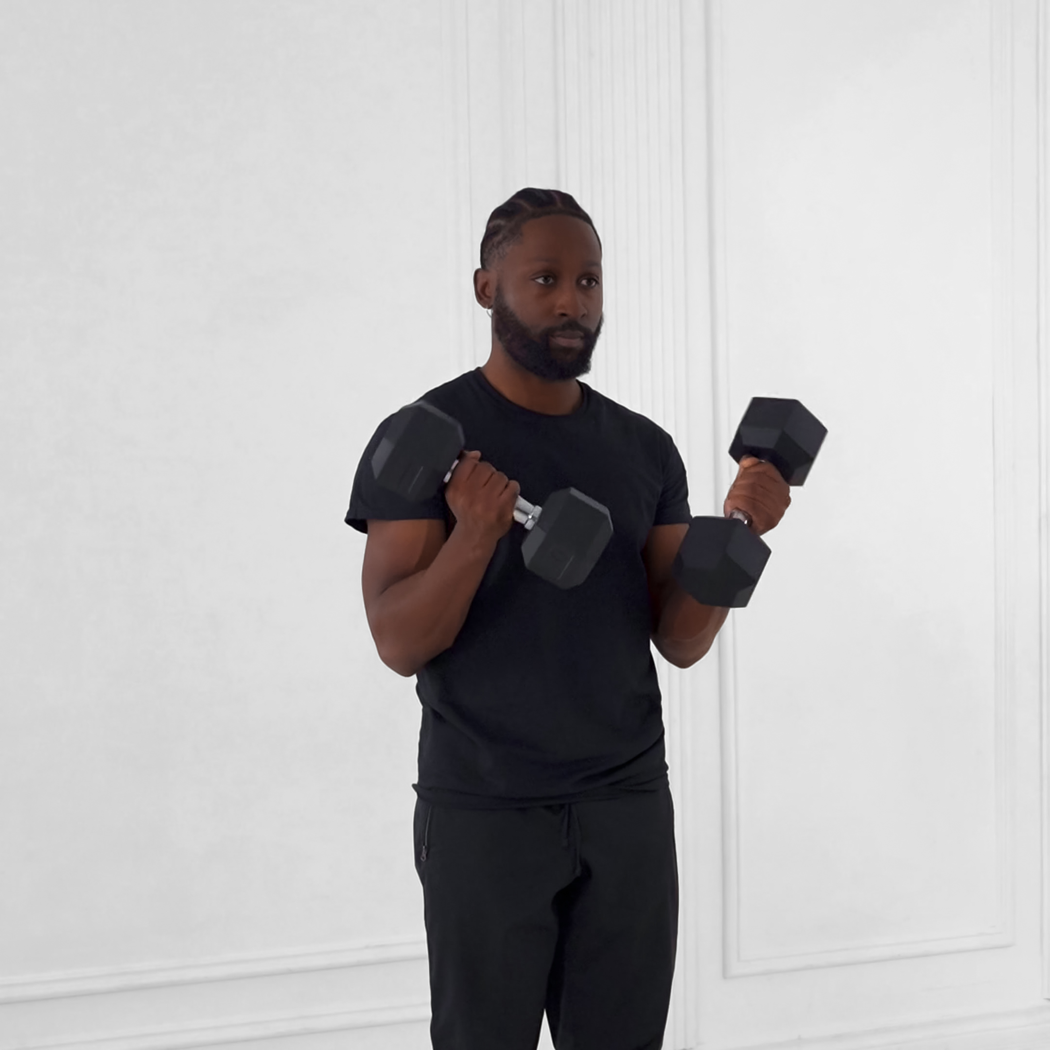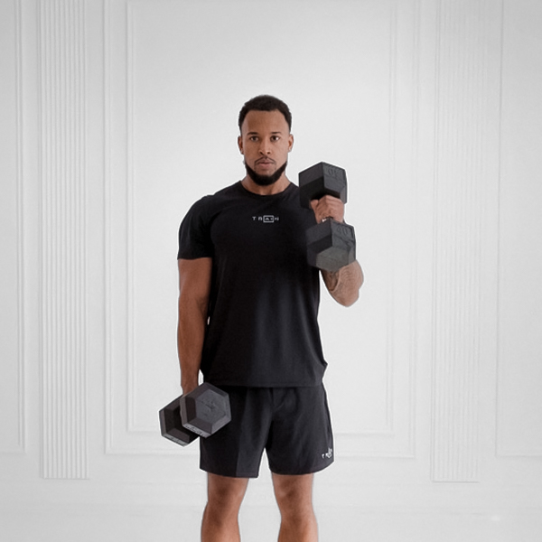 Stand upright holding dumbbells by your sides with palms facing your body (neutral grip) and shoulders back.