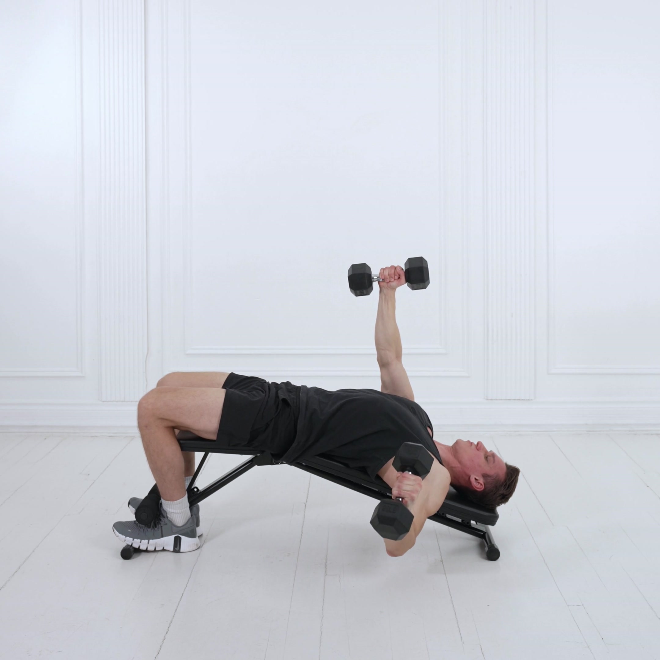 Lower until dumbbells align with chest or elbows slightly below bench level; raise until arms nearly straight above chest without locking elbows.