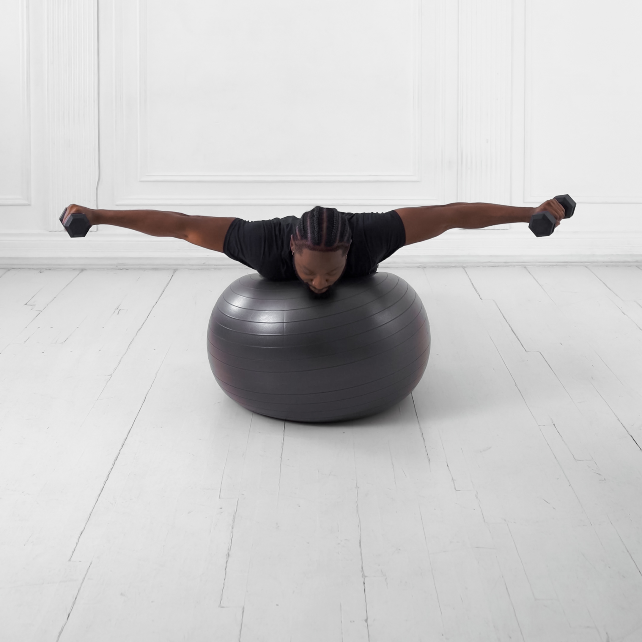 An advanced isolation exercise using dumbbells from a kneeling position on a stability ball, targeting medial deltoids while challenging core and balance for enhanced stability and proprioception.
