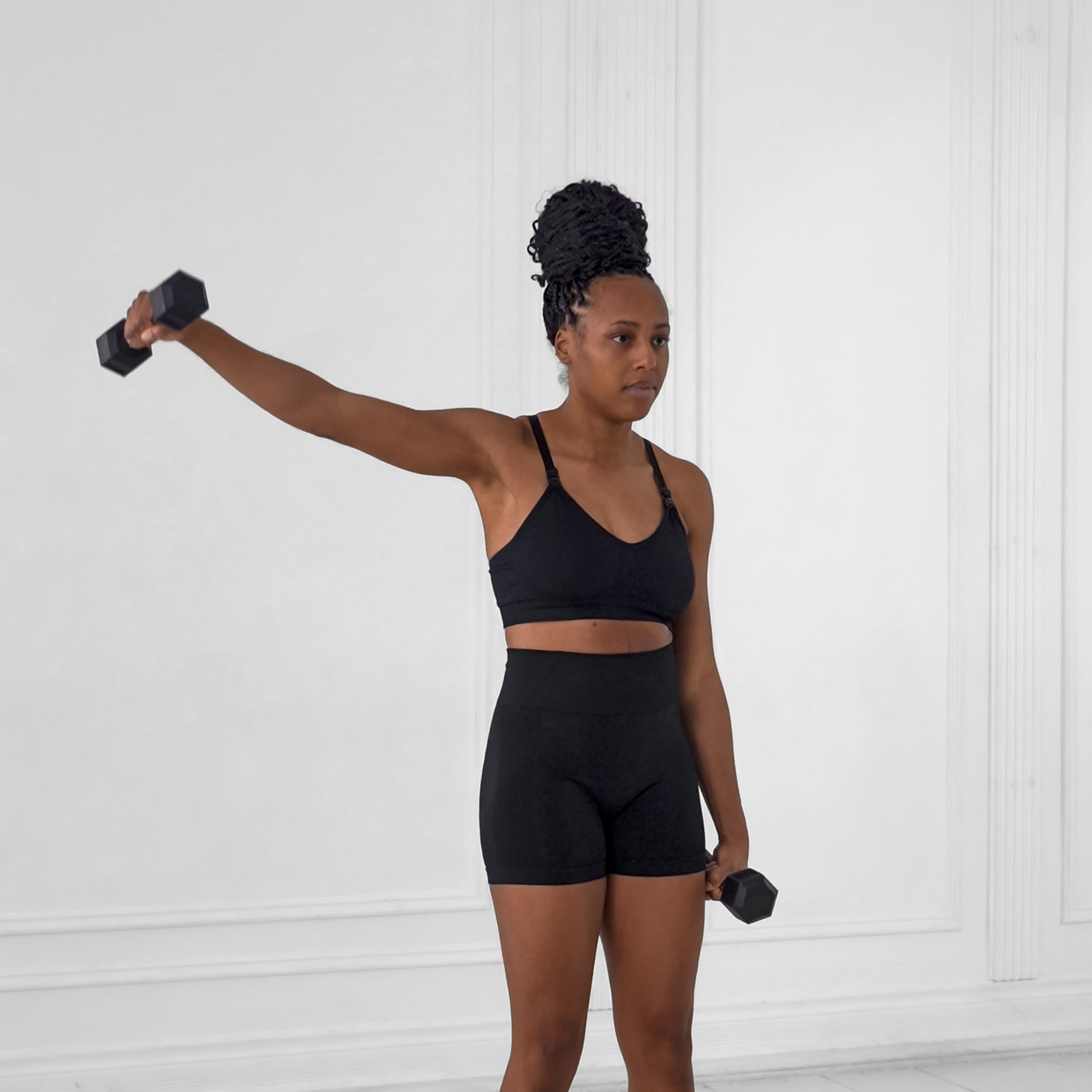 Lower dumbbells to sides with arms straight but elbows bent; raise to parallel with floor without going above shoulder height.