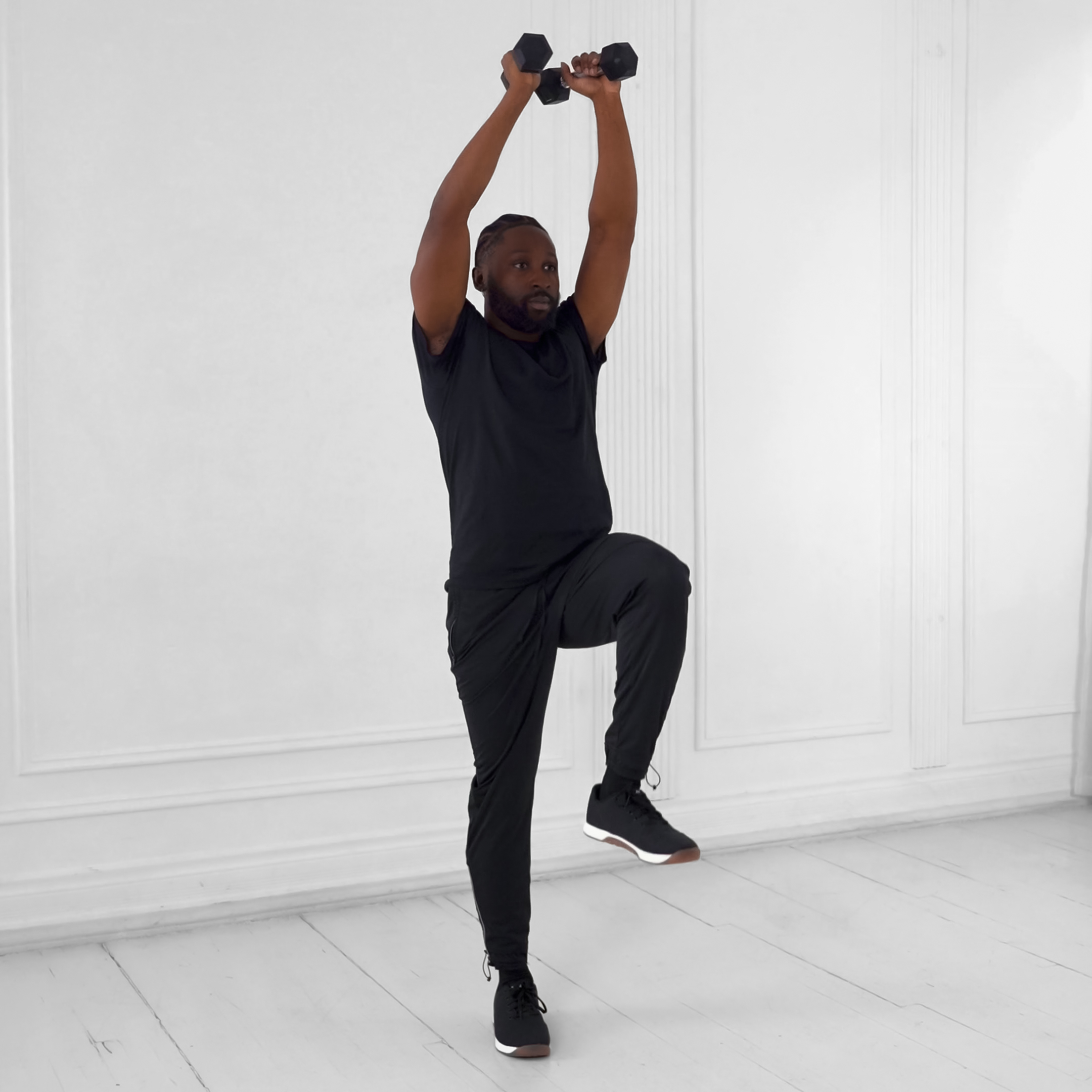 Fully extend arms overhead with dumbbells above ears; walk with full natural gait stride until endpoint, maintaining lockout.