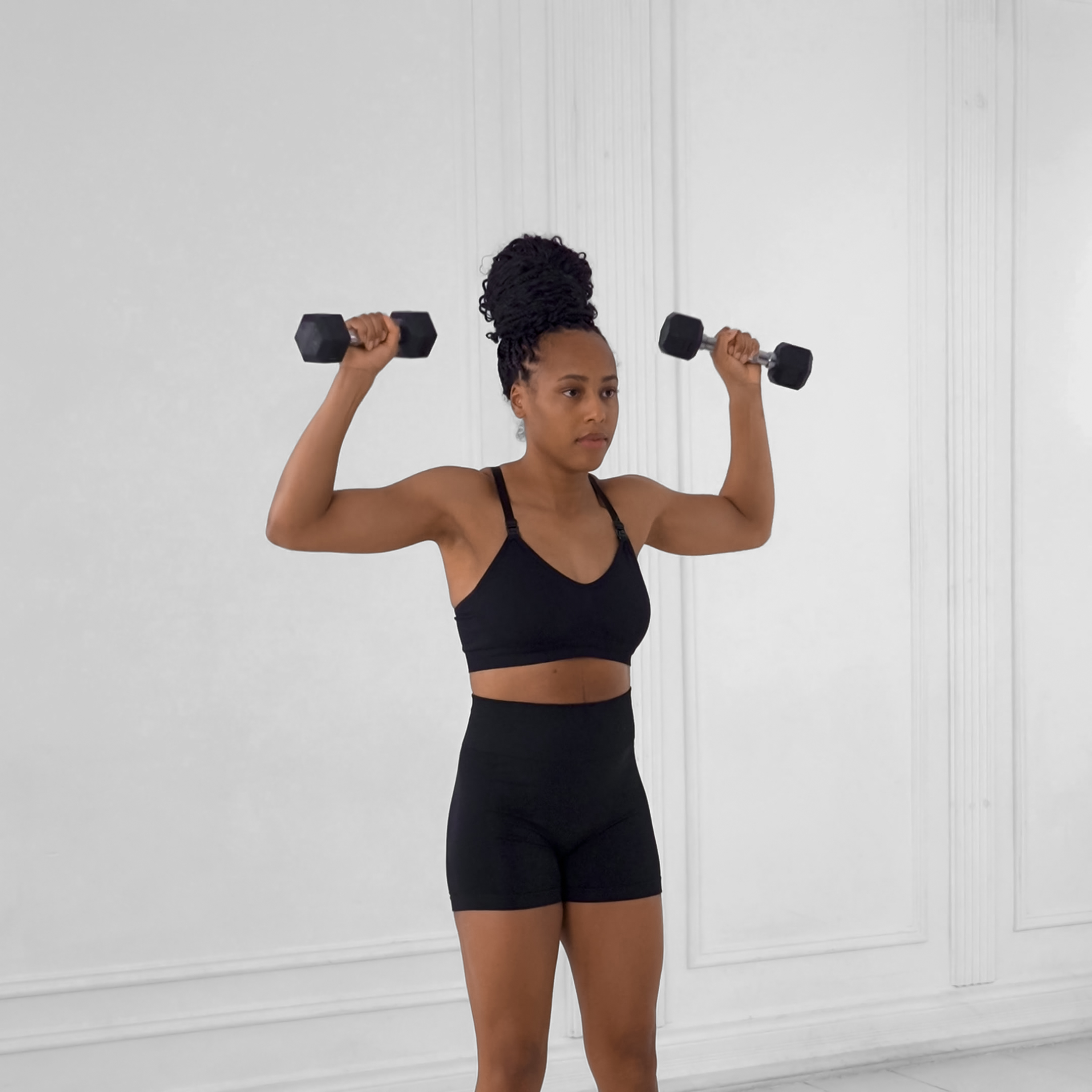 Lower until elbows are at shoulder height forming a 90-degree angle; extend arms fully overhead without hyperextending shoulders.