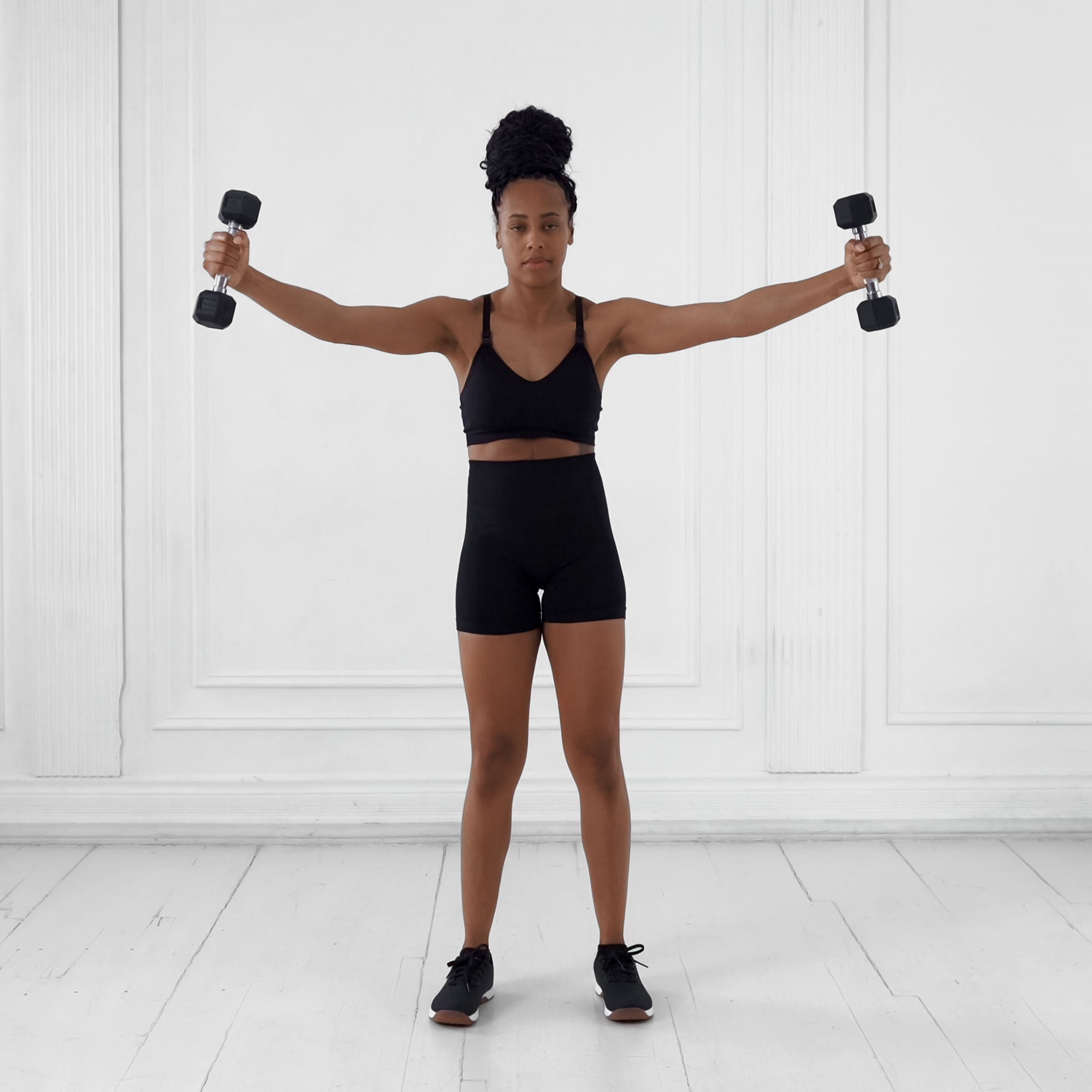Raise arms until level with torso or slightly above, thumbs up; lower until arms hang straight down without relaxing shoulders.