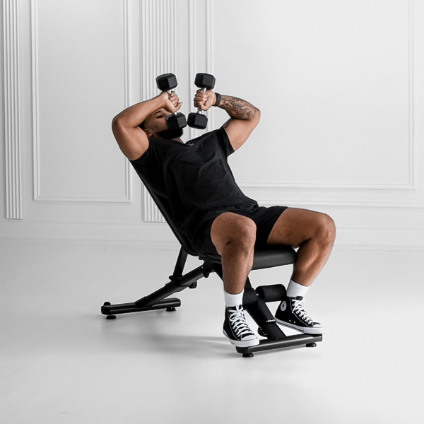 Dumbbell push press uses leg drive and a quarter squat to explosively press weights overhead, targeting shoulders and triceps for full-body strength and power development.