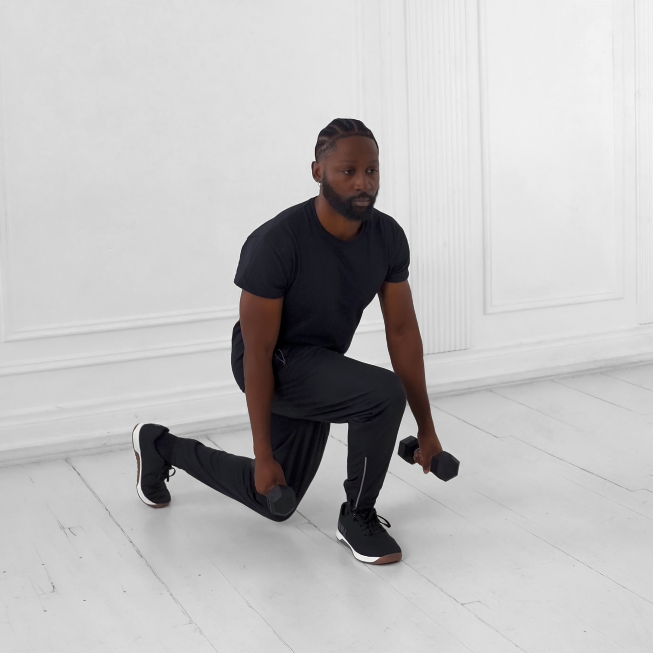 Inhale as you lower into the lunge, brace your core, and exhale as you drive up to stand.
