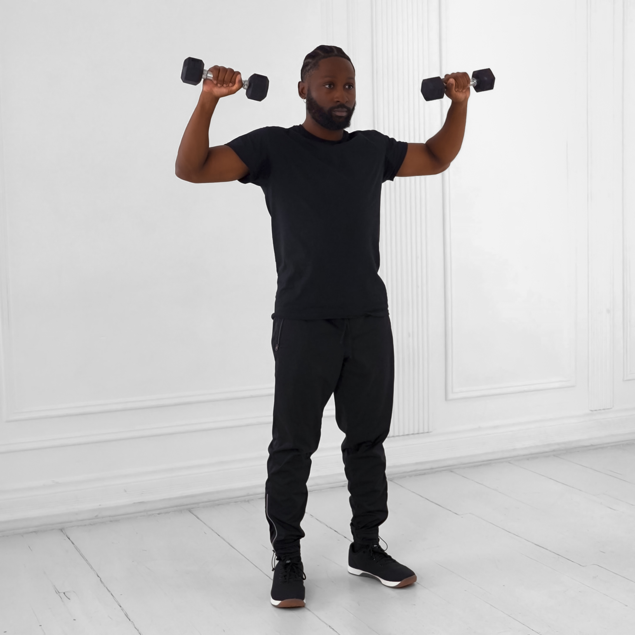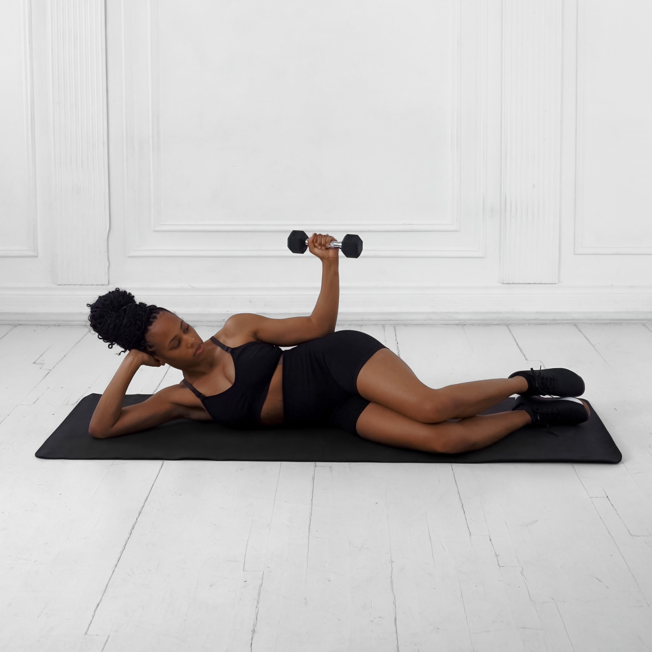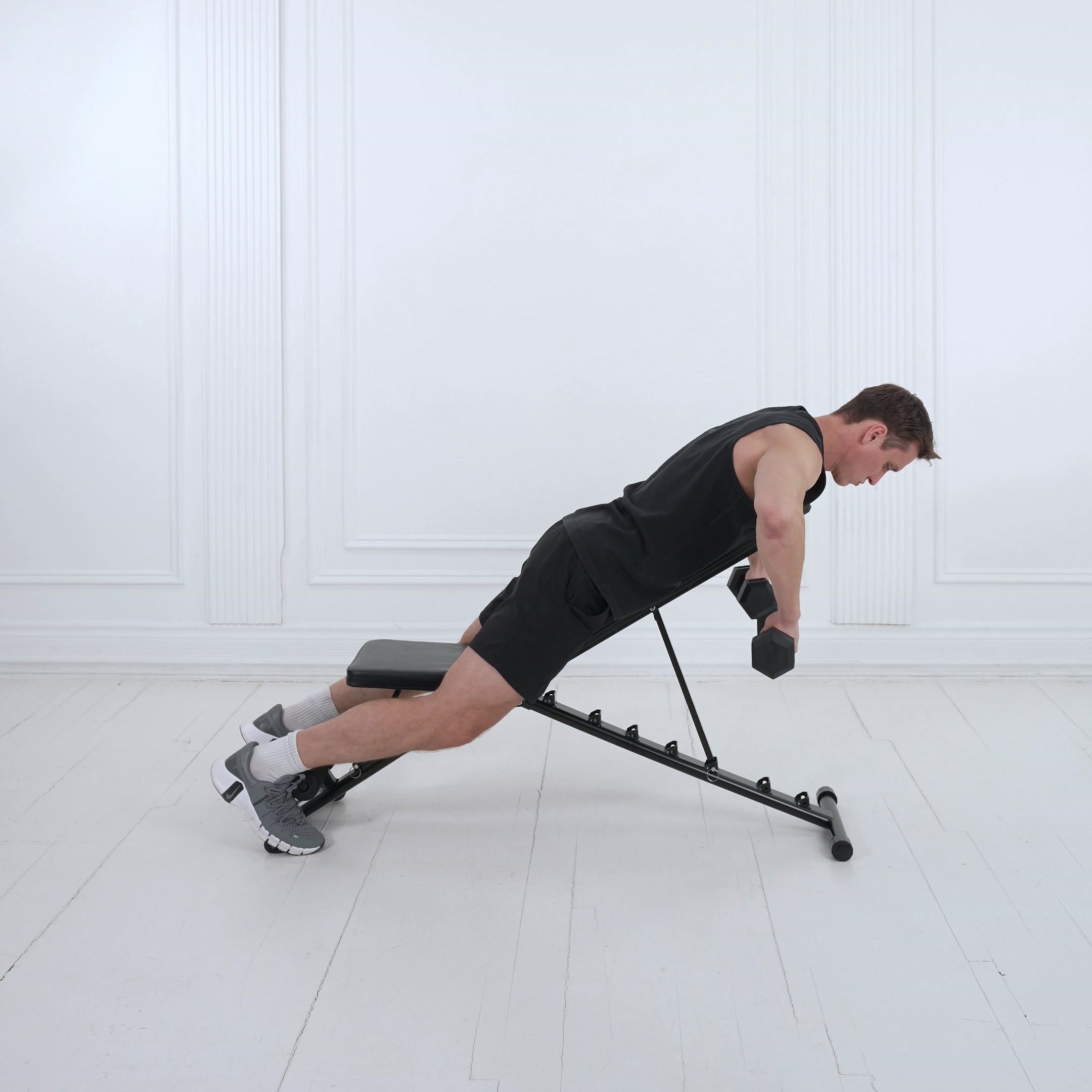 From dumbbells hanging directly below shoulders to arms extended backward parallel to torso; avoid excessive arching or swinging.