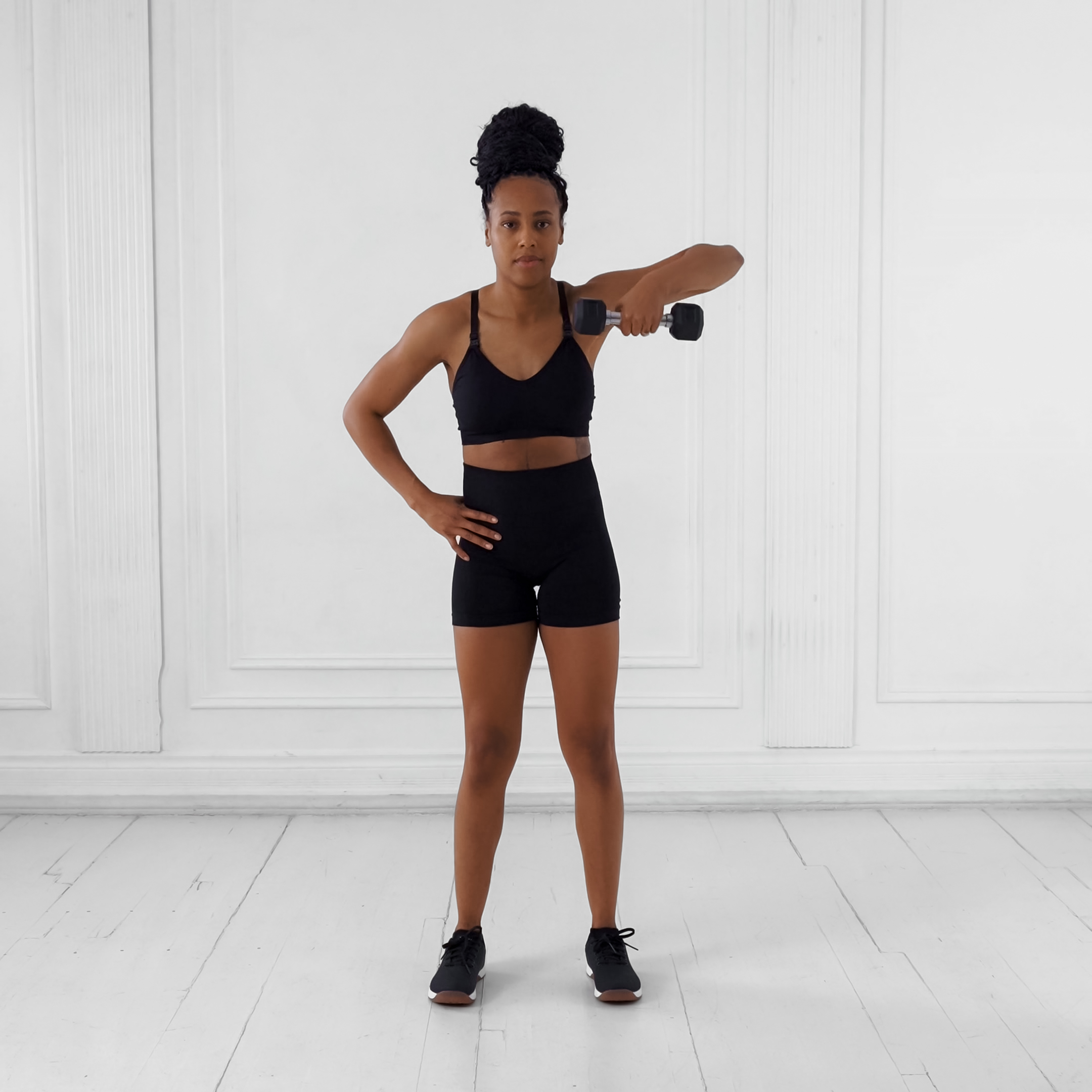 Stand with feet shoulder-width apart, knees slightly bent, core engaged. Hold a dumbbell in each hand at your sides with arms straight and neutral grip.