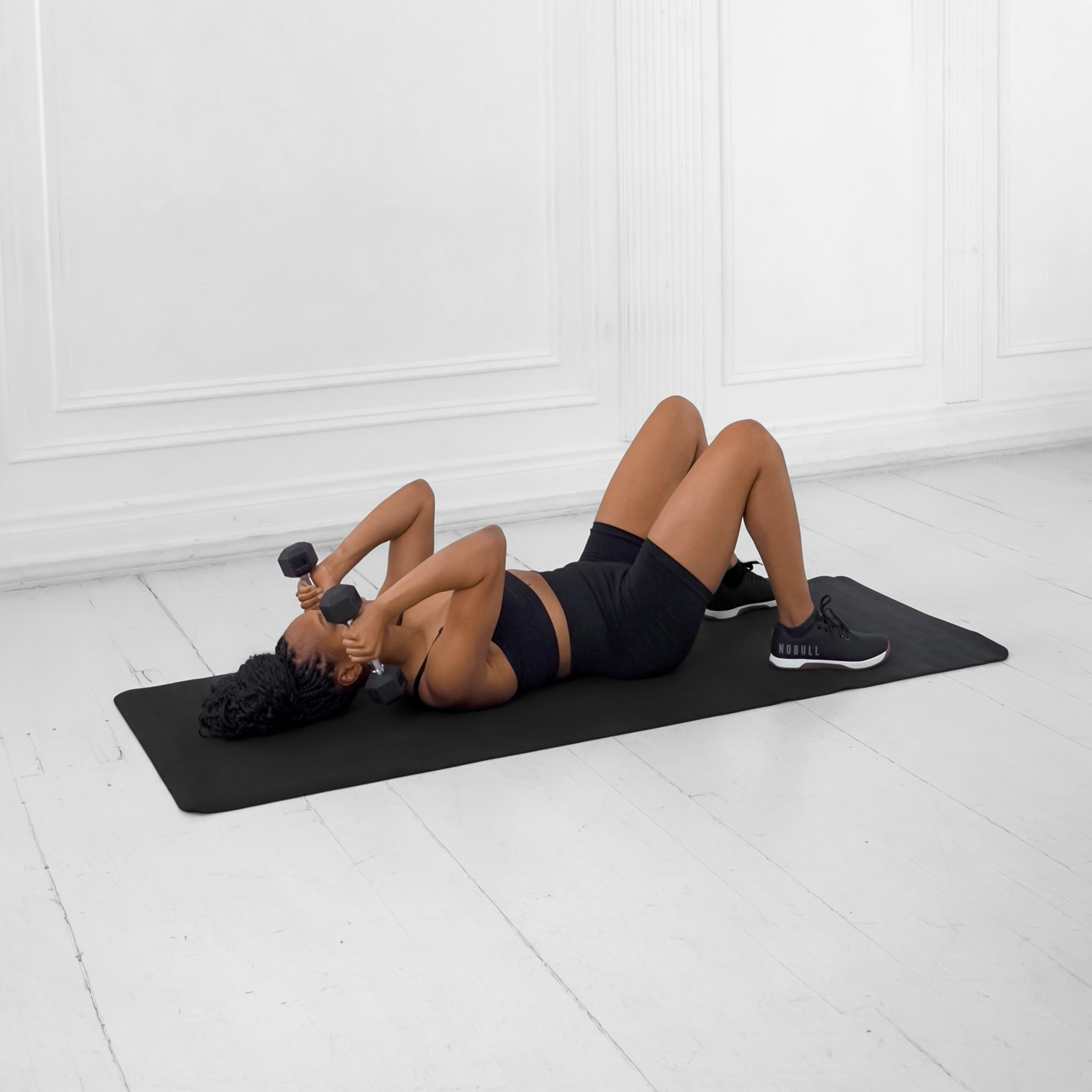 Lie supine on a flat bench with feet flat on the floor. Hold dumbbells with arms extended above your shoulders, palms facing each other.