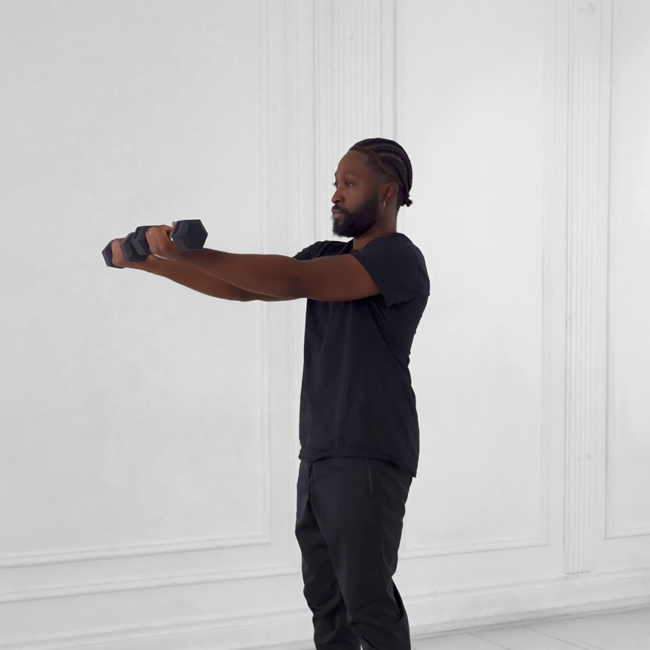 Stand with feet shoulder-width apart, holding light dumbbells at your sides with palms facing in and elbows slightly bent. Brace your core and keep shoulders down.