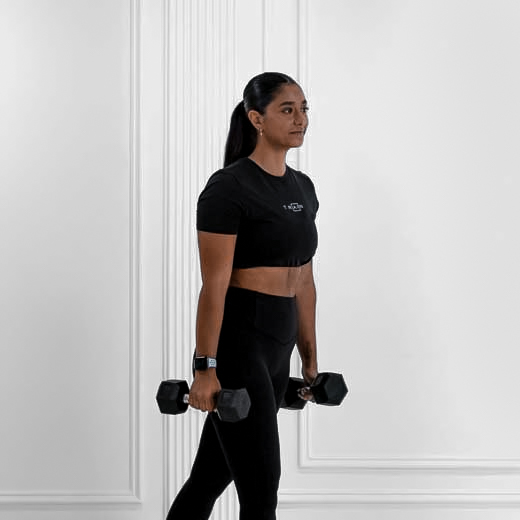 Isometric hold with dumbbells at sides that targets forearms, grip, core, and posture muscles to build endurance, strength, and stability; commonly used to improve time under tension and joint integrity.