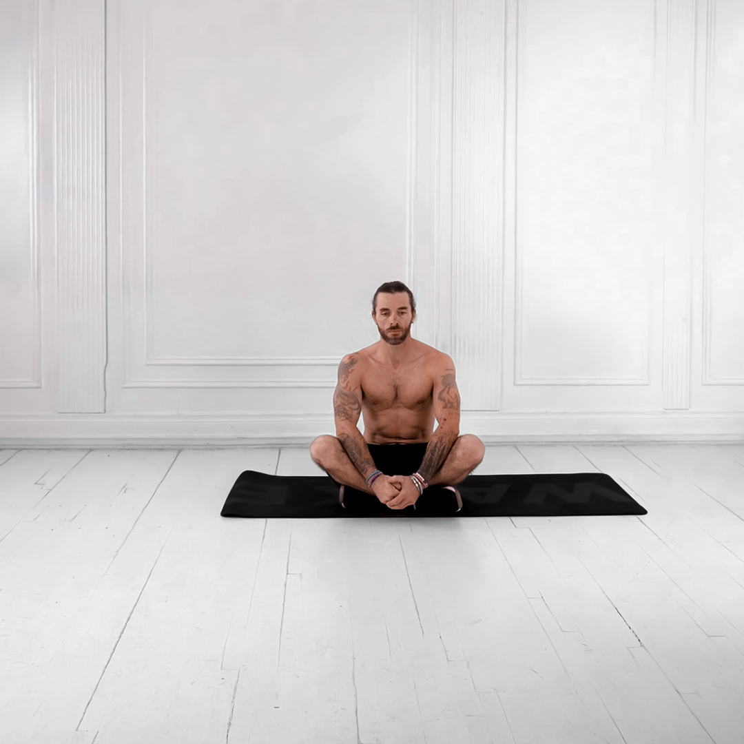 Sit on the floor or a prop with legs crossed comfortably, ensuring the knees are level with or below the hips. Stack the shoulders directly over the hips.
