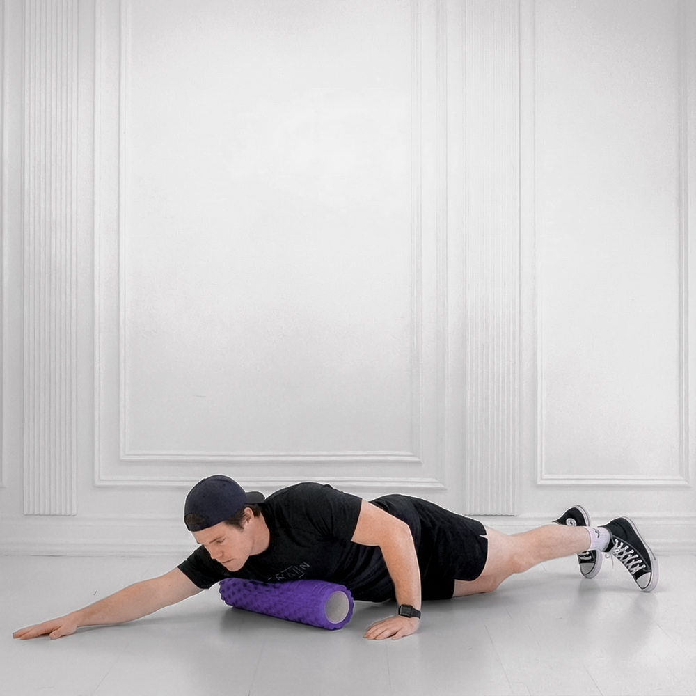 Lie face down on the floor with the foam roller positioned under one side of your chest near the armpit. Support your body with the opposite hand and feet.