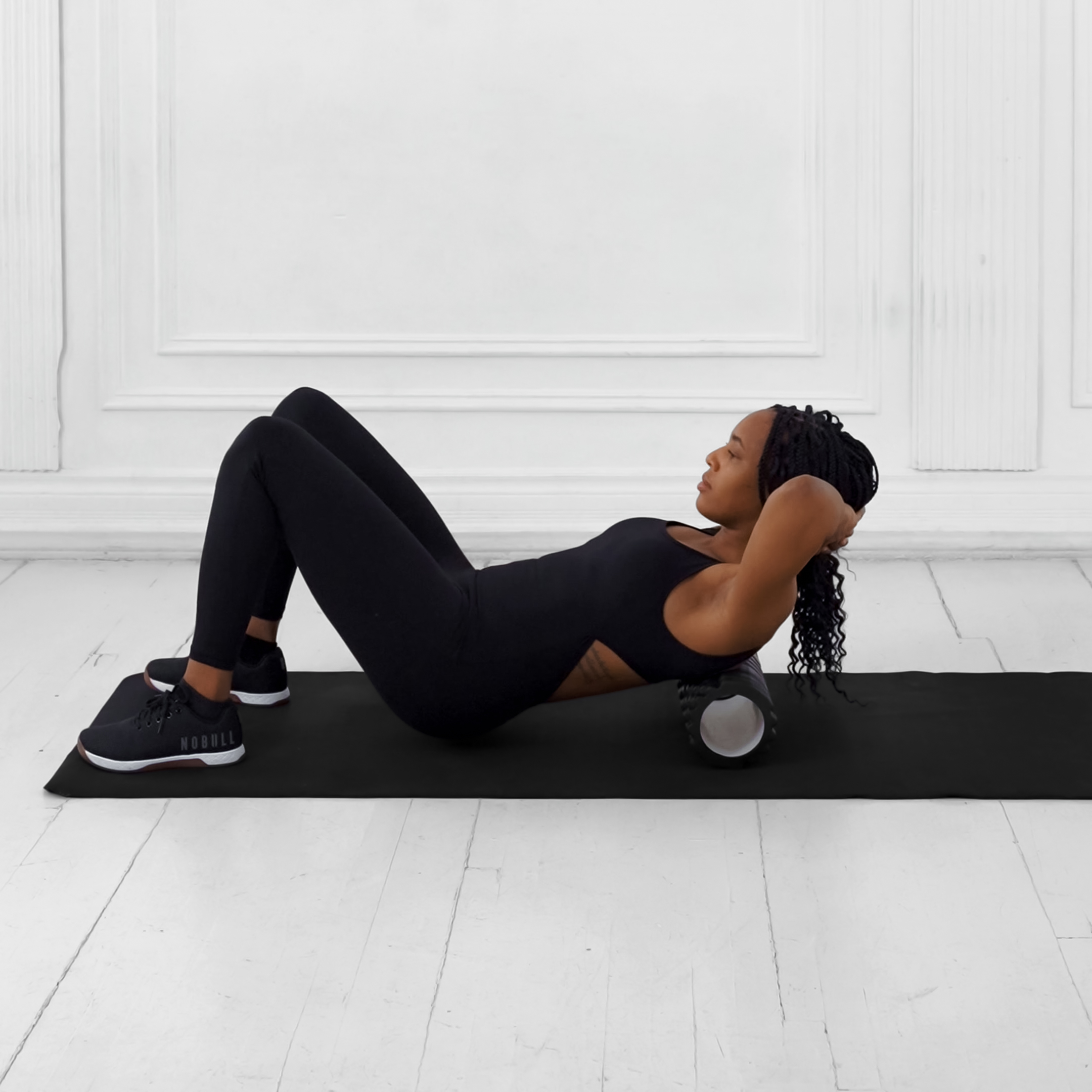 Lie on your side with foam roller under armpit, perpendicular to body. Extend bottom arm overhead, place top hand on floor for support, bend top knee with foot on ground.