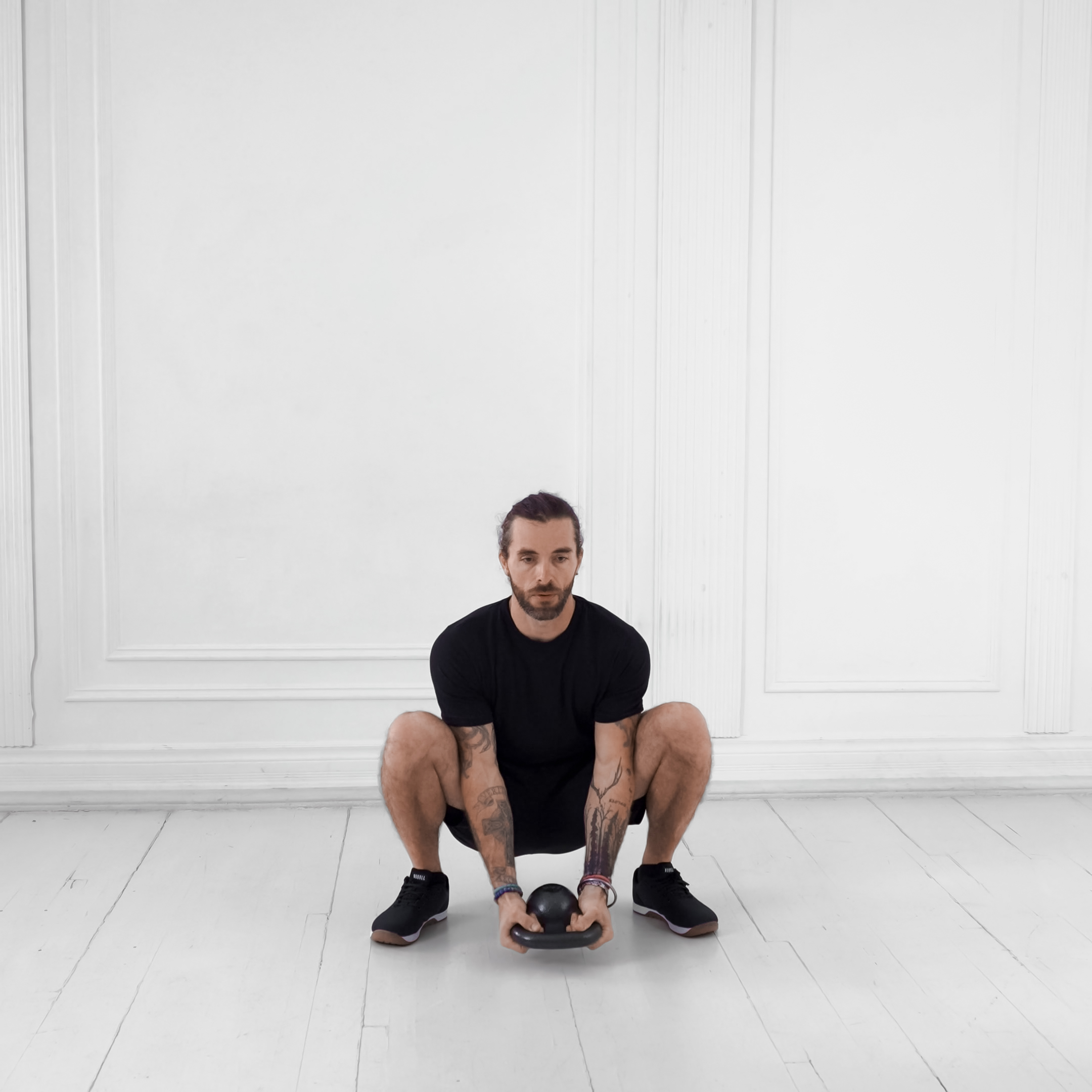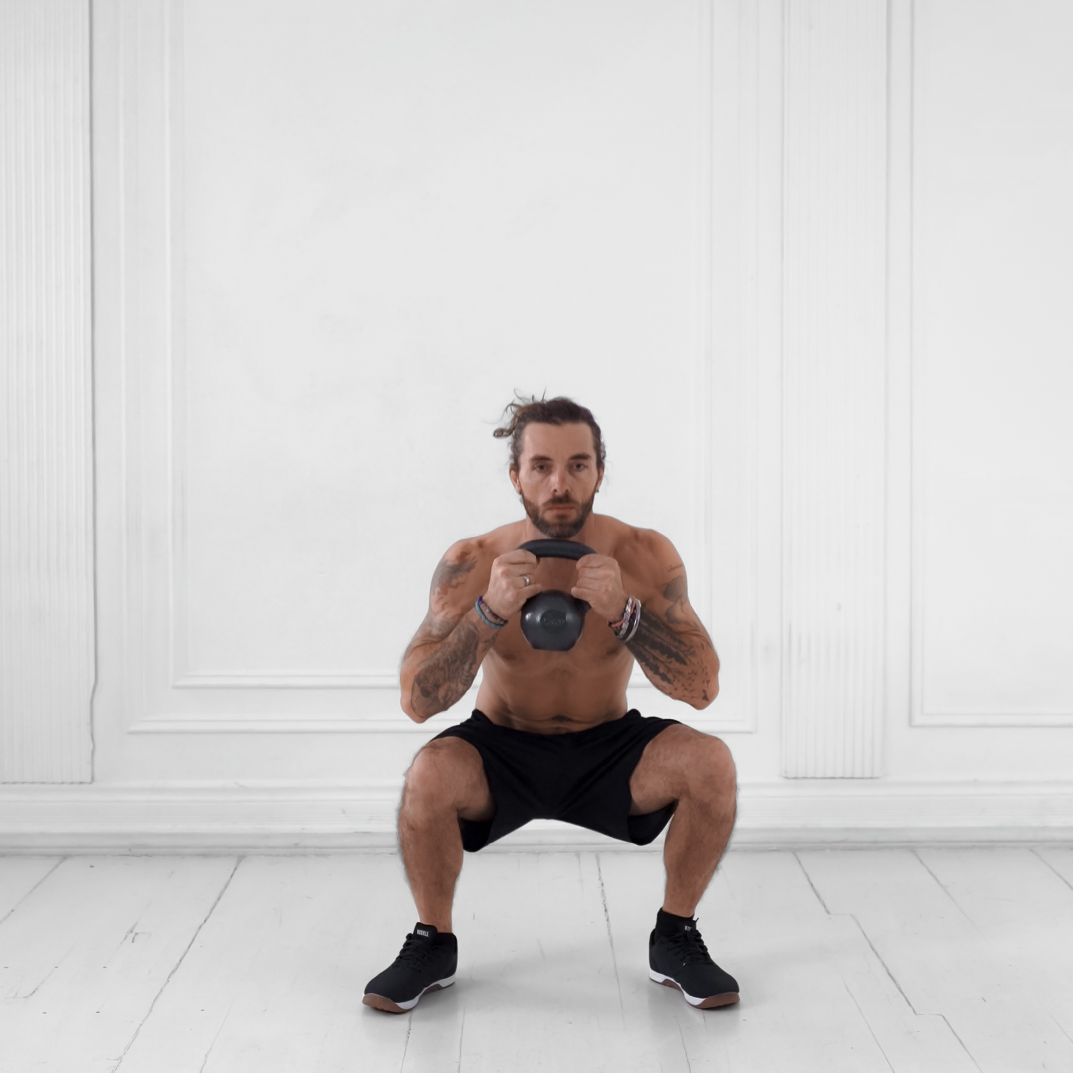 Inhale as you lower your hips; exhale forcefully as you drive back up.