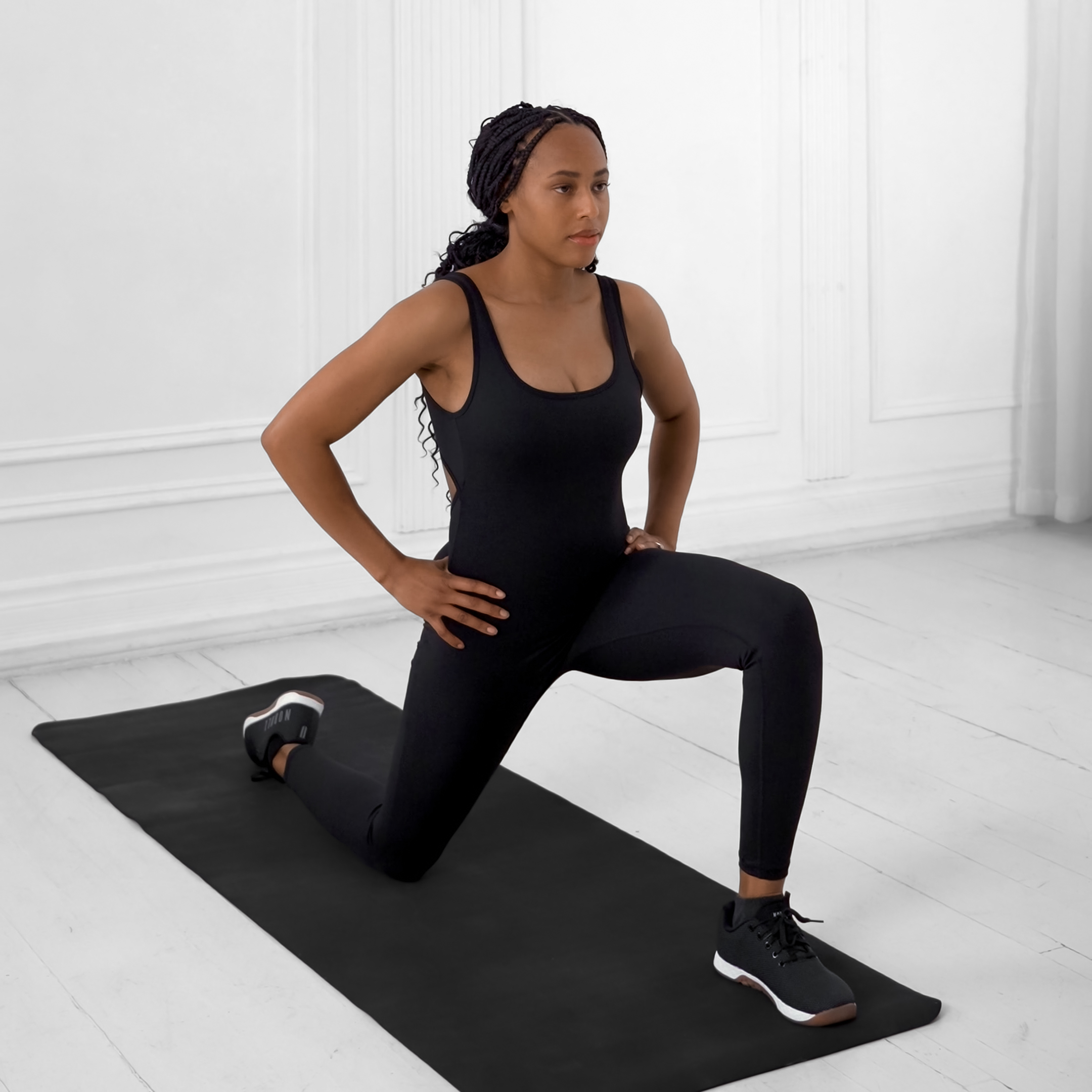 A bodyweight stretch that targets the psoas and hip flexors to improve hip mobility and alleviate lower back tension from sitting; hold for 30-60 seconds per side.