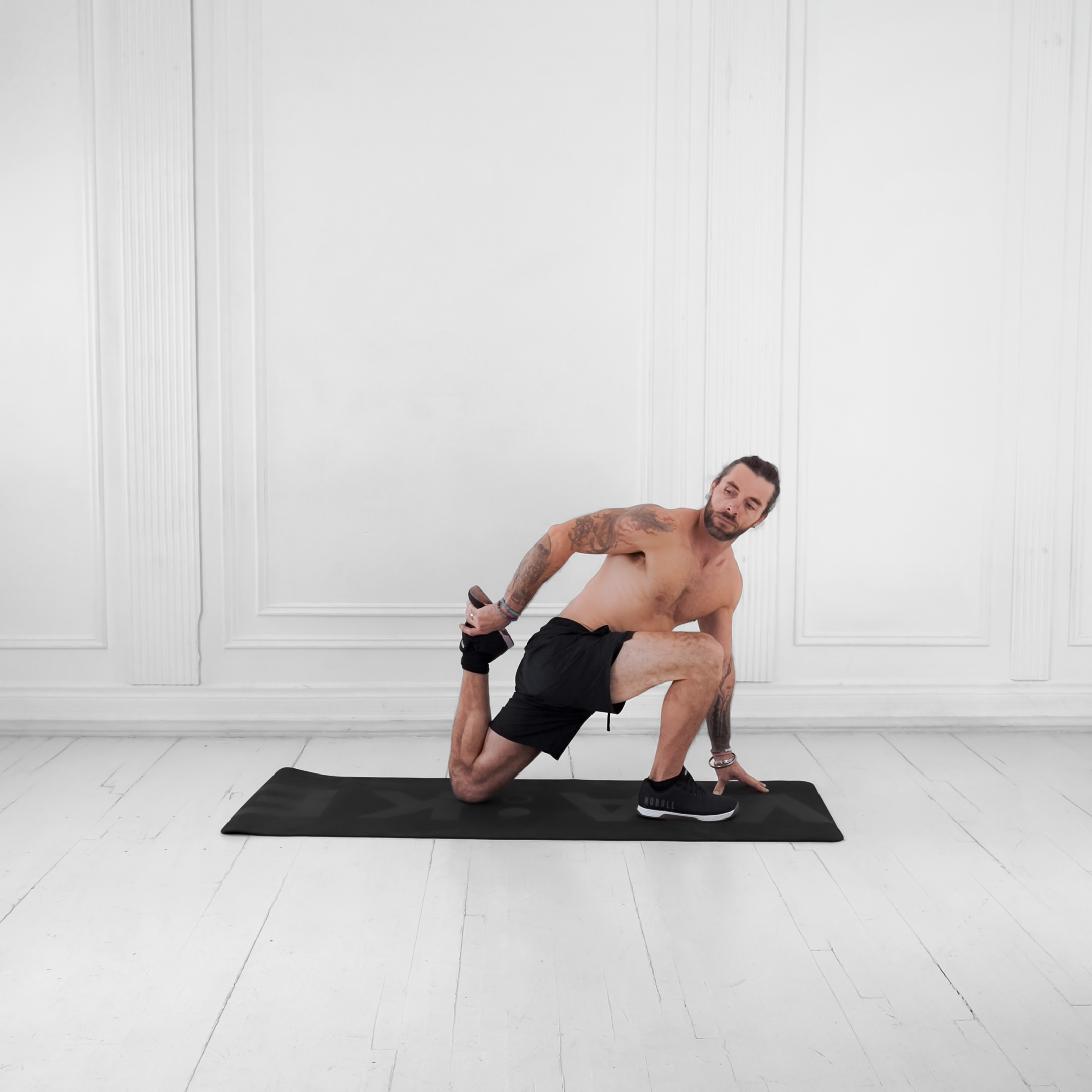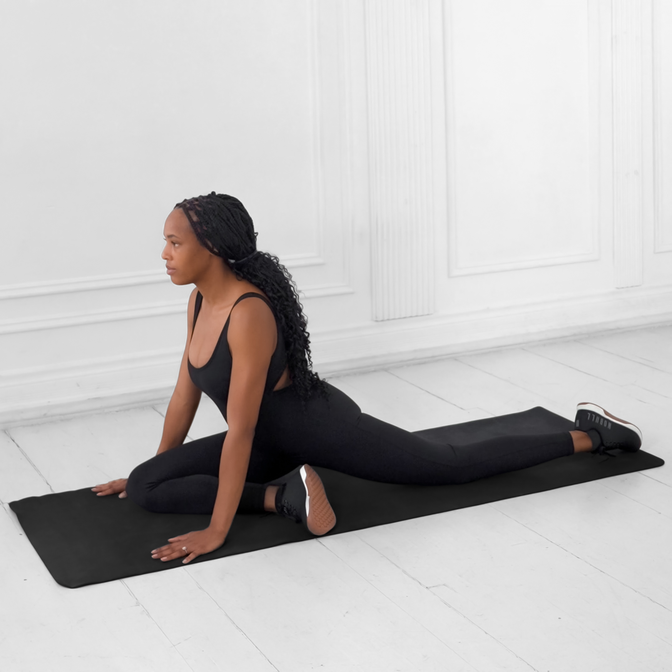 Front shin across mat with knee bent comfortably; back leg extended fully; torso upright or folded forward until hips release without knee strain.