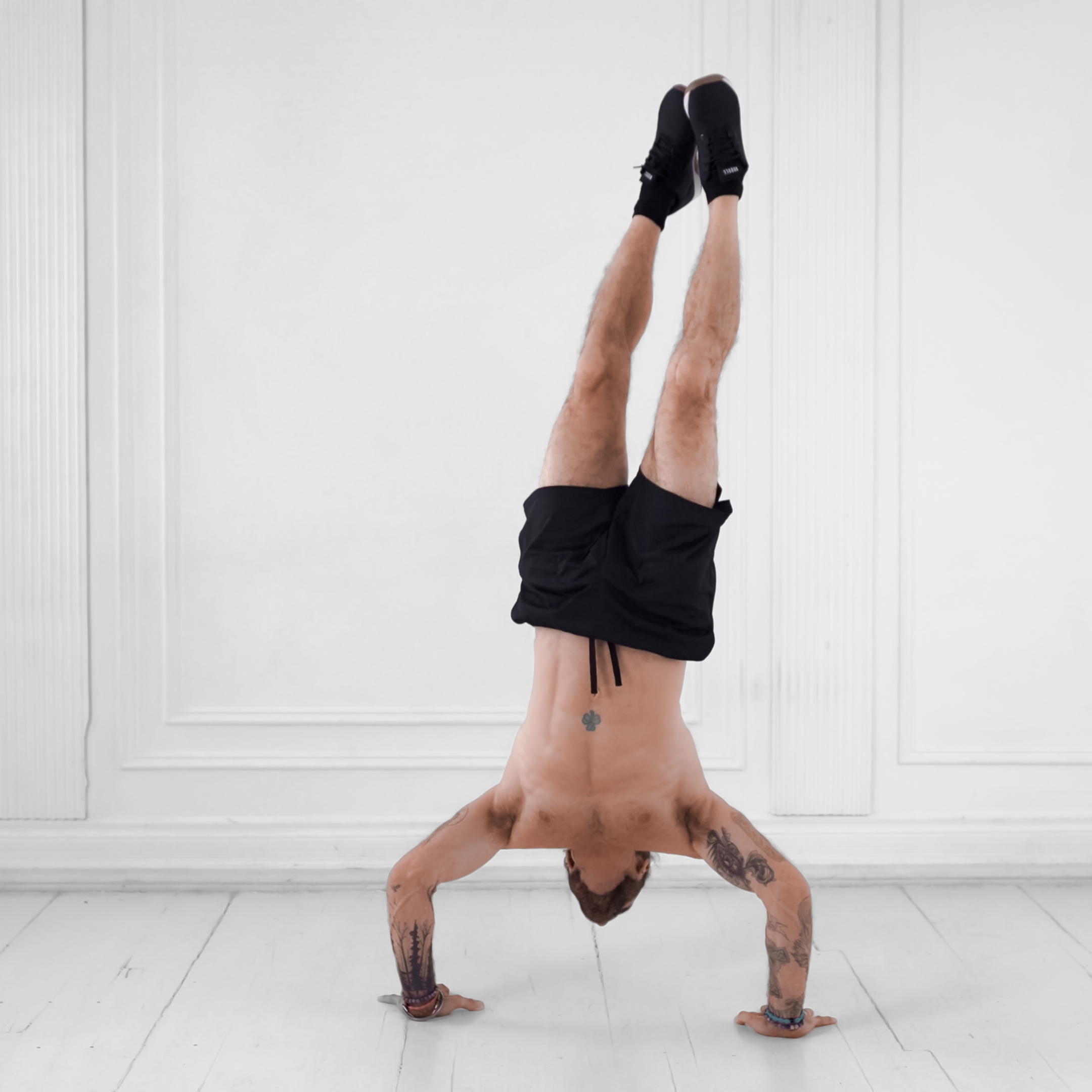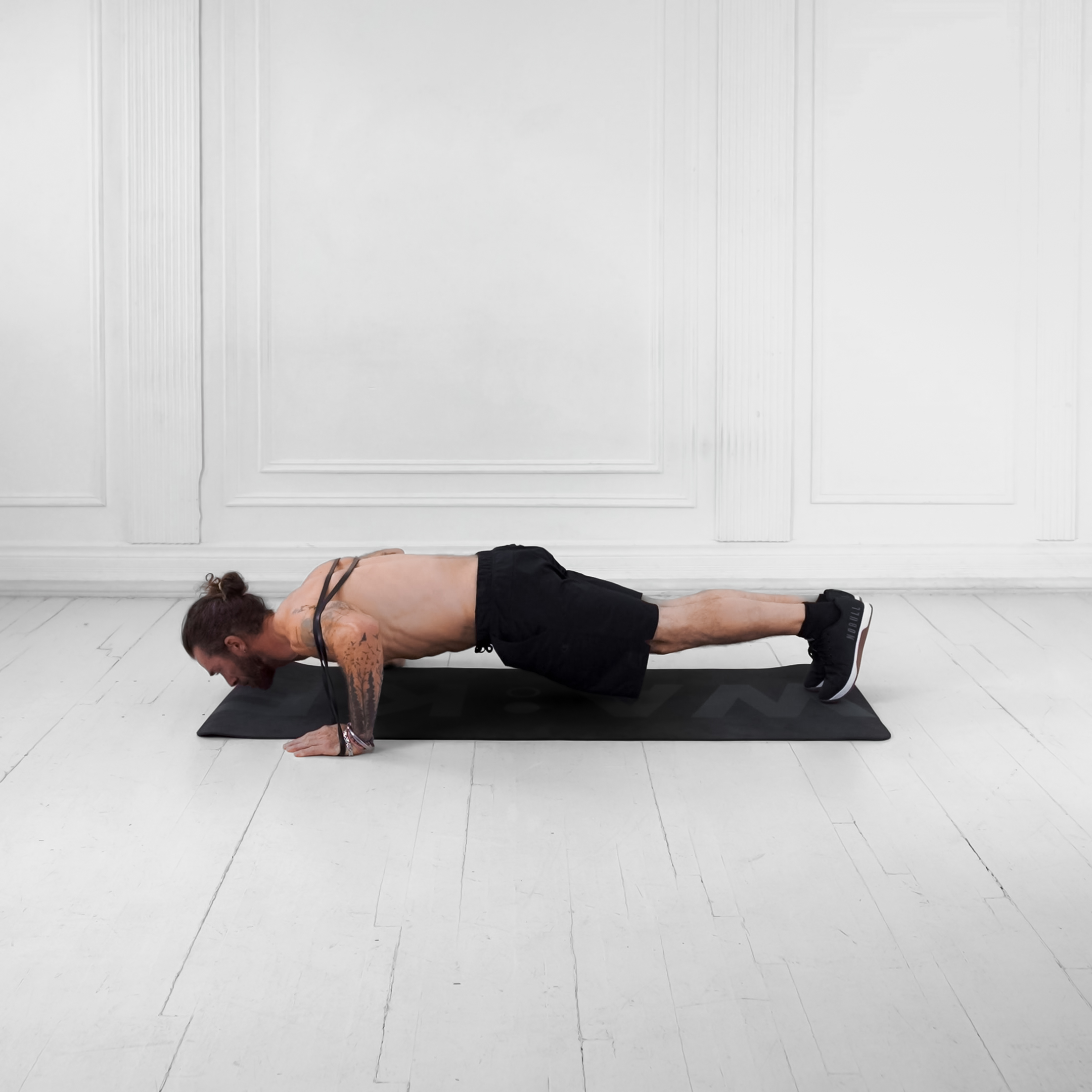 Start in a high plank position on the floor with hands slightly wider than shoulders, body in a straight line from head to heels, core and glutes engaged.