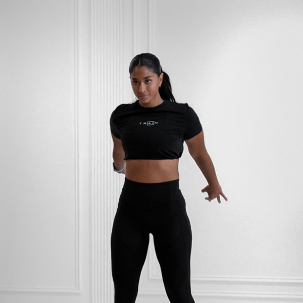 Stand with feet hip-width apart, arms at sides for balance. Engage core and look straight ahead.