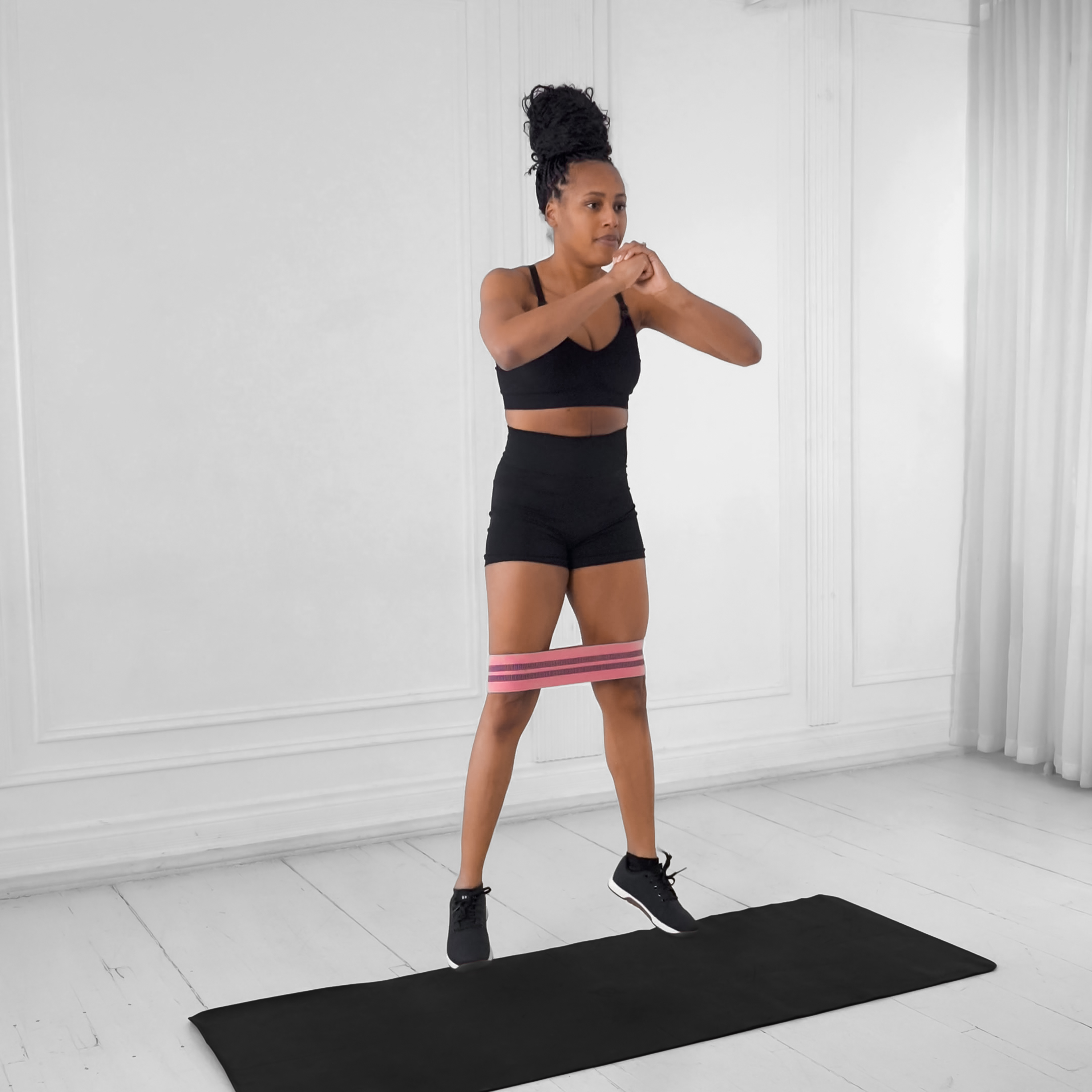 Lower until upper thighs are parallel to floor; fully extend hips and knees at top of jump without locking knees.